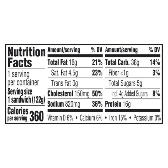 Details Ingredients CRAFT BURGER BUN (ENRICHED WHEAT FLOUR [FLOUR, NIACIN, IRON, THIAMINE MONONITRATE, RIBOFLAVIN, FOLIC ACID], WATER, SUGAR, EGGS, SUNFLOWER OIL, SALT, YEAST EXTRACT, MALTED BARLEY FLOUR), FRIED EGG PATTY (EGG WHITES, EGG YOLKS, SOYBEAN OIL, WATER, CORN STARCH-MODIFIED, SALT, BLACK PEPPER, CELLULOSE GUM, NATURAL BUTTER FLAVOR, XANTHAN GUM, CITRIC ACID [PRESERVATIVE]), PASTEURIZED PROCESSED AMERICAN SWISS CHEESE PRODUCT (CULTURED MILK, CULTURED SKIM MILK, WHEY, SALT, SODIUM CITRATE, FOOD STARCH-MODIFIED, COLOR ADDED, SODIUM PHOSPHATE, SORBIC ACID [PRESERVATIVE], LACTIC ACID, ENZYMES, SOY LECITHIN), BACON (WATER, SALT, SUGAR, SMOKE FLAVORING, SODIUM PHOSPHATE, SODIUM ERYTHORBATE, FLAVORING, SODIUM NITRITE). Show more Product features Bite into a mouthful of flavor with this Marketside Bacon, Egg and Cheese Brioche. It's packed with a fried egg patty, American Swiss cheese and bacon on a soft brioche bun. This delicious breakfast sandwich is perfect for a quick and easy meal at home, at work or the office, or on the go. While it's great for breakfast, you can also enjoy it any time of the day. Ready to eat in one minute, this sandwich has 16 grams of protein per serving to satisfy your hunger. Treat yourself to a delicious Marketside Bacon, Egg and Cheese Brioche. Fresh ideas and quality ingredients, that's how Marketside brings the best foods to your table. We are committed to deliver freshness that you can taste and see. Marketside offers the best in fresh food, guaranteed by Walmart, working in partnership with farmers, bakers and chefs for the highest quality, authentic ingredients and favorite recipes. Marketside Bacon, Egg & Cheese Brioche, 4.3 oz: Heat and eat Ready in 1 minute Quick and easy grab-and-go meal Great for breakfast, lunch or dinner 16 grams of protein per serving