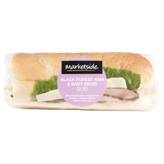 Details Ingredients Ingredients: Uncured black forest ham artificially colored (no nitrates or nitrites added except for those naturally occurring in celery juice powder) contains up to 1596 added solution of water, salt, vinegar, celery juice powder, sodium phosphates, natural flavor. Roll: enriched flour (wheat flour, malted barley flour, niacin, reduced iron, thiamine mononitrate, riboflavin, folic acid), water, sugar, less than 2% of mono-and diglycerides, wheat flour, enzymes, ascorbic acid, calcium propionate (preservative), salt, soy oil, yeast, natural flavor, dextrin. Baby Swiss cheese: cultured pasteurized milk, salt, enzymes. Romaine lettuce. Show more Product features Marketside Black Forest Ham and Baby Swiss Sub is made on a white French sub roll and is jam-packed with all your favorite sandwich fillings including Black Forest ham, baby Swiss, and romaine lettuce This filling sub is perfect for quick and easy meals at home, in the office or on the go. Make it an extra hearty meal and serve with a side of crispy potato chips and a piping-hot cup of your favorite soup. This sandwich is great on its own but can also be personalized with all your favorite veggies and condiments. It comes packaged in a plastic wrapper to help maintain freshness and ready to eat for your convenience. Bite into a mouthful of flavor with this Marketside Black Forest Ham and Baby Swiss Sub. Fresh ideas and quality ingredients, that's how Marketside brings the best foods to your table. We are committed to deliver freshness that you can taste and see. Marketside offers the best in fresh food, guaranteed by Walmart, working in partnership with farmers, bakers and chefs for the highest quality, authentic ingredients and favorite recipes. Marketside Black Forest Ham and Baby Swiss Sub (Half): Black Forest ham, baby Swiss, romaine lettuce/li> Perfect for a quick and easy meal Pair with your favorite chips or soup Single serving Allergy Notice Our stores may use some of the following ingredients: peanuts, eggs, soy, tree nuts, wheat, dairy products, fish, and/or shellfish. Even if these are not listed on the ingredient label, please be aware that all products may have come in contact with these ingredients.