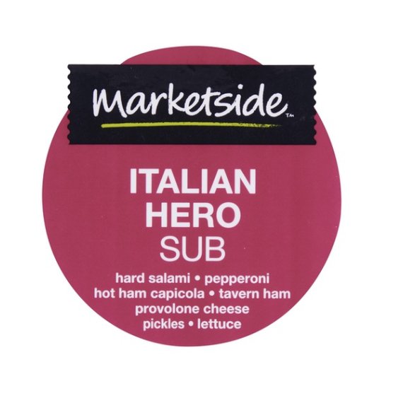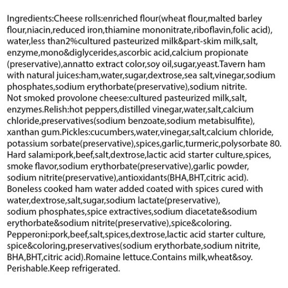Details Ingredients INGREDIENTS: DILL PICKLE PLANKS FRESH CUCUMBERS, WATER, VINEGAR, SAL, CALCIUM CHLORIDE, POTASSIUM SORBATE (PRESERVATIVE), SPICES, GARLIC, TURMERIC, POLYSORBATE 80. UNCURED TAVERN HAM NITRITES CONTAINS UP TO 15% OF A SEASONING SOLUTION, CELERY JUICE POWDER, SODIUM PHOSPHATES, NATURAL FLAVOR. PROVOLONE CHEESE CULTURED PASTEURIZED MILK, SALT, ENZYMES. HOT RELISH PEPPERS, DISTILLED VINEGAR, WATER, SALT, CALCIUM CHLORIDE, SODIUM BENZOATE (AS AS A PRESERVATIVE) HARD SALAMI, LACTIC ACID STARTER, NATURAL SMOKE FLAVOR, SODIUM NITRITE, SPICES, BHA, era, aux ACID. UNCURED COOKED PORK CAPICOLA I CONTAINS UP TO 20% OF A SEASONING SOLUTION I NO NITRATES OR NITRITES ADDED" SOLUTION INGREDIENTS: WATER, SEASONING (SPICES, PAPRIKA, AFLIC7DEA(ATURAF=E'ATTWESPPAPTNT:is:TaLESS Rii1GA' SALT, FLAVOR,. PEPPERONI SALT, CC OR Of BEEF DEXTROSE, FLAVORINGS, LACTIC ACID STARTER CULTURE, OLEORESIN OF PAPRIKA, SODIUM NITRITE, SPICES, VITAMIN C (SODIUM ASCORBATE), BHA, BHT, CITRIC ACID. Show more Product features Marketside Italian Hero Sub is jam-packed with all your favorite sandwich fillings including hard salami, pepperoni, hot ham capicola, tavern ham, provolone cheese, pickles, and lettuce. This filling sub is perfect for quick and easy meals at home, in the office or on the go. Make it an extra hearty meal and serve with a side of crispy potato chips and a piping-hot cup of your favorite soup. This sandwich is great on its own but can also be personalized with all your favorite veggies and condiments. It comes packaged in a plastic wrapper to help maintain freshness and ready to eat for your convenience. Bite into a mouthful of flavor with this Marketside Italian Hero Sub. Fresh ideas and quality ingredients, that's how Marketside brings the best foods to your table. We are committed to deliver freshness that you can taste and see. Marketside offers the best in fresh food, guaranteed by Walmart, working in partnership with farmers, bakers and chefs for the highest quality, authentic ingredients and favorite recipes. Marketside Italian Hero Sub (Full): Hard salami, pepperoni, pepperoni, hot ham capicola, tavern ham, provolone cheese, pickles, and lettuce/li> Perfect for a quick and easy meal Pair with your favorite chips or soup Single serving Allergy Notice Our stores may use some of the following ingredients: peanuts, eggs, soy, tree nuts, wheat, dairy products, fish, and/or shellfish. Even if these are not listed on the ingredient label, please be aware that all products may have come in contact with these ingredients.