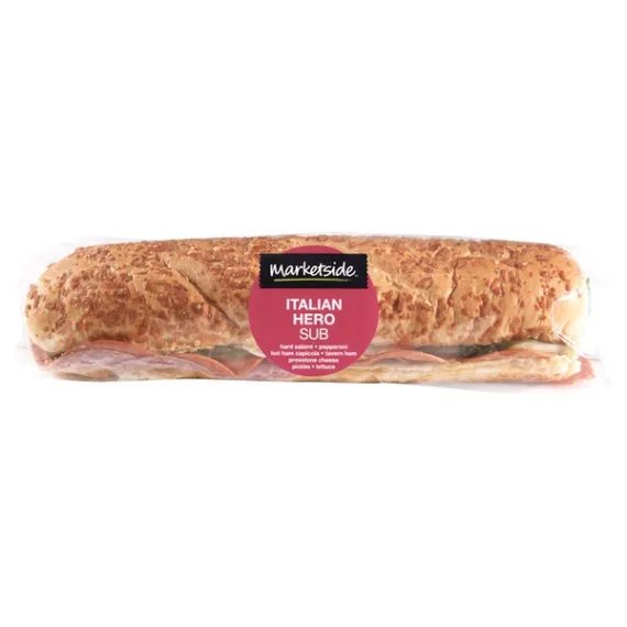 Details Ingredients INGREDIENTS: DILL PICKLE PLANKS FRESH CUCUMBERS, WATER, VINEGAR, SAL, CALCIUM CHLORIDE, POTASSIUM SORBATE (PRESERVATIVE), SPICES, GARLIC, TURMERIC, POLYSORBATE 80. UNCURED TAVERN HAM NITRITES CONTAINS UP TO 15% OF A SEASONING SOLUTION, CELERY JUICE POWDER, SODIUM PHOSPHATES, NATURAL FLAVOR. PROVOLONE CHEESE CULTURED PASTEURIZED MILK, SALT, ENZYMES. HOT RELISH PEPPERS, DISTILLED VINEGAR, WATER, SALT, CALCIUM CHLORIDE, SODIUM BENZOATE (AS AS A PRESERVATIVE) HARD SALAMI, LACTIC ACID STARTER, NATURAL SMOKE FLAVOR, SODIUM NITRITE, SPICES, BHA, era, aux ACID. UNCURED COOKED PORK CAPICOLA I CONTAINS UP TO 20% OF A SEASONING SOLUTION I NO NITRATES OR NITRITES ADDED" SOLUTION INGREDIENTS: WATER, SEASONING (SPICES, PAPRIKA, AFLIC7DEA(ATURAF=E'ATTWESPPAPTNT:is:TaLESS Rii1GA' SALT, FLAVOR,. PEPPERONI SALT, CC OR Of BEEF DEXTROSE, FLAVORINGS, LACTIC ACID STARTER CULTURE, OLEORESIN OF PAPRIKA, SODIUM NITRITE, SPICES, VITAMIN C (SODIUM ASCORBATE), BHA, BHT, CITRIC ACID. Show more Product features Marketside Italian Hero Sub is jam-packed with all your favorite sandwich fillings including hard salami, pepperoni, hot ham capicola, tavern ham, provolone cheese, pickles, and lettuce. This filling sub is perfect for quick and easy meals at home, in the office or on the go. Make it an extra hearty meal and serve with a side of crispy potato chips and a piping-hot cup of your favorite soup. This sandwich is great on its own but can also be personalized with all your favorite veggies and condiments. It comes packaged in a plastic wrapper to help maintain freshness and ready to eat for your convenience. Bite into a mouthful of flavor with this Marketside Italian Hero Sub. Fresh ideas and quality ingredients, that's how Marketside brings the best foods to your table. We are committed to deliver freshness that you can taste and see. Marketside offers the best in fresh food, guaranteed by Walmart, working in partnership with farmers, bakers and chefs for the highest quality, authentic ingredients and favorite recipes. Marketside Italian Hero Sub (Full): Hard salami, pepperoni, pepperoni, hot ham capicola, tavern ham, provolone cheese, pickles, and lettuce/li> Perfect for a quick and easy meal Pair with your favorite chips or soup Single serving Allergy Notice Our stores may use some of the following ingredients: peanuts, eggs, soy, tree nuts, wheat, dairy products, fish, and/or shellfish. Even if these are not listed on the ingredient label, please be aware that all products may have come in contact with these ingredients.