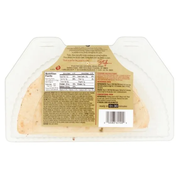Details Ingredients DOUGH: ENRICHED UNBLEACHED WHEAT FLOUR (WHEAT FLOUR, NIACIN, IRON, THIAMINE MONONITRATE, RIBOFLAVIN, FOLIC ACID), WATER, SOYBEAN OIL (WITH CITRIC ACID ADDED AS A PRESERVATIVE), DOUGH CONDITIONER (SALT, DEXTROSE, WHEAT FLOUR, MONO AND DIGLYCERIDES, ASCORBIC ACID, L-CYSTEINE), PALM OIL, YEAST (YEAST, SORBITAN MONOSTEARATE, ASCORBIC ACID). FILLING: PHILLY STEAK MIX (COOKED BEEF PHILLY STEAK [BEEF, WATER, LESS THAN 2% OF MODIFIED FOOD STARCH {POTATO/CORN}, SALT, ONION POWDER, GARLIC POWDER, SODIUM PHOSPHATE, MALTODEXTRIN, NATURAL FLAVORING, HYDROLYZED CORN AND SOY PROTEIN, HYDROLYZED CORN PROTEIN, HYDROLYZED WHEAT GLUTEN, HYDROLYZED SOY PROTEIN, AUTOLYZED YEAST EXTRACT, BEEF TALLOW, SUGAR, DEHYDRATED COOKED BEEF, DISODIUM INOSINATE & GUANYLATE, LACTIC ACID, NATURAL BUTTER FLAVOR {WITH BUTTER FAT}, NATURAL FLAVOR, GRILL FLAVOR {FROM SOYBEAN OIL}, SPICES, BROMELAIN, SOYBEAN OIL, CARAMEL COLOR. MAY CONTAIN DEXTROSE, TOMATO POWDER, SILICON DIOXIDE, LEMON POWDER {LEMON JUICE, MALTODEXTRIN}, CITRIC ACID], ONIONS, GREEN BELL PEPPERS), PROVOLONE CHEESE (PASTEURIZED MILK, CULTURES, SALT, ENZYMES). TOPPING: PARMESAN & ROMANO CHEESE BLEND (PARMESAN CHEESE [MADE FROM COW'S MILK, SALT, ENZYMES], ROMANO CHEESE [MADE FROM COW'S MILK, SALT, ENZYMES], POWDERED CELLULOSE/STARCH BLEND ADDED TO PREVENT CAKING), BREAD CRUMBS (BLEACHED FLOUR, WATER, VEGETABLE SHORTENING [ONE OR MORE OF THE FOLLOWING: PARTIALLY HYDROGENATED SOYBEAN OIL AND/OR COTTON SEED OIL], SALT, YEAST, CONTAINS 2% OR LESS OF THE FOLLOWING: SUGAR, DEXTROSE), PARSLEY, OREGANO. Show more Product features Philly Cheese Steak, Onions, Green Peppers & Provolone Cheese Filling in a Golden Pocket Stefano Foods, 4825 Hovis Road, Charlotte, NC, 28208. www.stefanofoods.com Net Quantity of Content 2 X 113 g