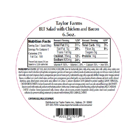 Details Ingredients ROMAINE LETTUCE, AVOCADO RANCH DRESSING (low fat buttermilk [skim milk, whey, water, skim milk solids, whey solids, corn starch, tapioca starch, disodium phosphate, carrageenan gum, locust bean gum, culture], canola oil, water, avocado pulp, non fat sour cream [cultured skim milk, corn starch, tapioca starch, carrageenan gum, locust bean gum], maltodextrin, egg yolk, sugar, salt, distilled vinegar, cider vinegar, natural flavors, modified corn starch, dried onion, xanthan gum, carrageenan gum, dried garlic, soy sauce [water, wheat, soybeans, salt, lactic acid], cultured dextrose, spice, dried green onion, lactic acid, yellow 5 & 6, blue 1, calcium disodium EDTA [added to protect quality]), GRAPE TOMATOES, CHICKEN BREAST MEAT WITH RIB MEAT (chicken breast meat with rib meat, water, cultured sugar and vinegar, potato starch, sea salt, natural flavorings), BACON PIECES (cured with water, salt, sugar, sodium nitrite. may also contain smoke flavoring, dextrose, brown sugar, sodium phosphates, sodium erythorbate, sodium ascorbate, potassium chloride, flavoring), MILD CHEDDAR CHEESE (cheddar cheese [pasteurized milk, cheese culture, salt, enzymes, annatto {vegetable color}], potato starch and powdered cellulose [to prevent caking], natamycin [a natural mold inhibitor]), RED CABBAGE, CARROT. Show more Product features Want the taste of a mouthwatering BLT with none of the guilt? Ditch the carbs and try our Taylor Farms BLT Salad with Chicken. Enjoy a fresh blend of romaine, red cabbage, and carrots paired with grape tomatoes, grilled white meat chicken, bacon, cheddar cheese, and a creamy avocado ranch dressing. This salad is a great source of protein and comes conveniently packaged with fork and dressing included. Ready to eat and bursting with flavor, our Taylor Farms on-the-go salads are the perfect choice for any lifestyle. Taylor Farms BLT Salad w/ Chicken, 6.5 oz Fresh salad blend featuring crisp romaine, red cabbage, carrots, grape tomatoes, white chicken meat, bacon, cheddar cheese and a creamy avocado dressing. Ready to eat salad with fork included High in Protein Perfect lunch or dinner choice Net Quantity of Content 1 X 164g