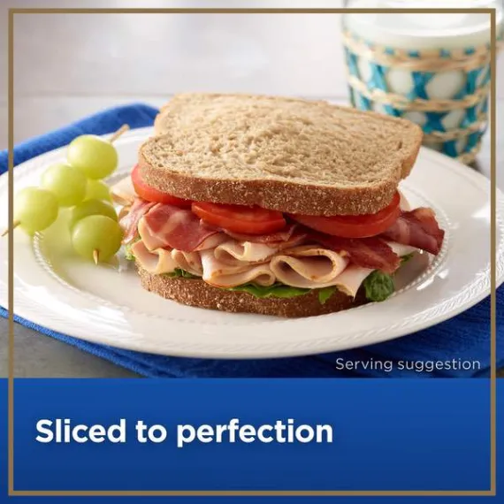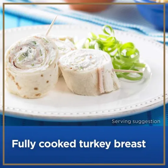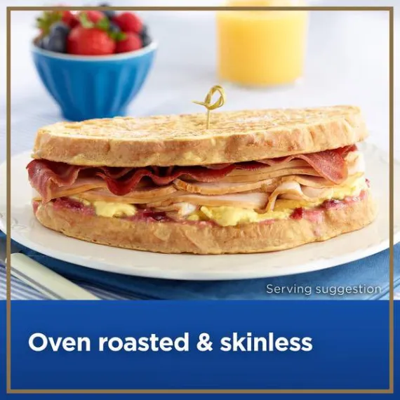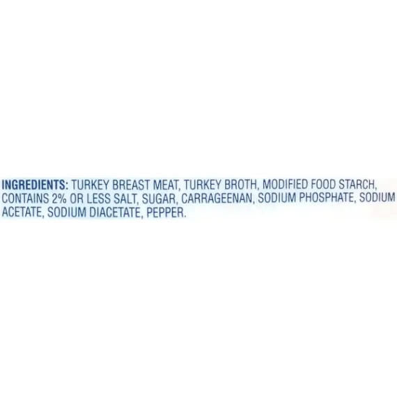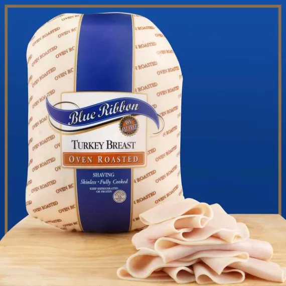 Details Ingredients Turkey Breast Meat, Turkey Broth, Modified Food Starch, Contains 2% or less Salt, Sugar, Carrageenan, Sodium Phosphate, Sodium Acetate, Sodium Diacetate, Pepper. Show more Product features BLUE RIBBON Oven Roasted Turkey Breast gives you a premium turkey taste in any of your sandwiches and wraps for a more nutritious, deli-fresh alternative to grocery store cold cuts. It's 98 percent fat free and all natural*. BLUE RIBBON deli sliced turkey at the deli counter or order online for Walmart Grocery Pickup. 98% Fat Free Fully cooked deli sliced turkey breast 11 grams of protein; 50 calories per serving Gluten free Allergy Notice Our stores may use some of the following ingredients: peanuts, eggs, soy, tree nuts, wheat, dairy products, fish, and/or shellfish. Even if these are not listed on the ingredient label, please be aware that all products may have come in contact with these ingredients.