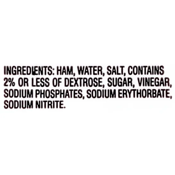 Details Ingredients Ham Cured with Water, Salt, Contains 2% or Less of Dextrose, Sodium Erythorbate, Sodium Nitrite, Sodium Phosphate, Sugar. Product features Our fully cooked deli ham is perfectly seasoned for a phenomenal flavor that everyone is sure to love. From company luncheons to quick weekday dinners, and all things in between, Eckrich deli meats are the ideal solution for mealtime. Perfectly Seasoned Lunch Meat - Our Cooked deli ham is perfectly seasoned so you can enjoy it sliced on your favorite sandwich or sub. Simple and Delicious Meal Solution - Eckrich deli meats are ideal for a quick weekday meal that is both simple and delicious. Eckrich Has You Covered - Whether you are providing cold cuts for a luncheon, or putting together quick family dinners, Eckrich deli meats have you covered. Amazing Flavor - Our products are crafted with just the right blend of spices for a truly rich, savory taste. Tradition of Taste and Excellence - Eckrich has been producing the best quality, flavorful deli meats since 1894. Allergy Notice Our stores may use some of the following ingredients: peanuts, eggs, soy, tree nuts, wheat, dairy products, fish, and/or shellfish. Even if these are not listed on the ingredient label, please be aware that all products may have come in contact with these ingredients. Net Quantity of Content 104.0 X 2 oz. (56g)