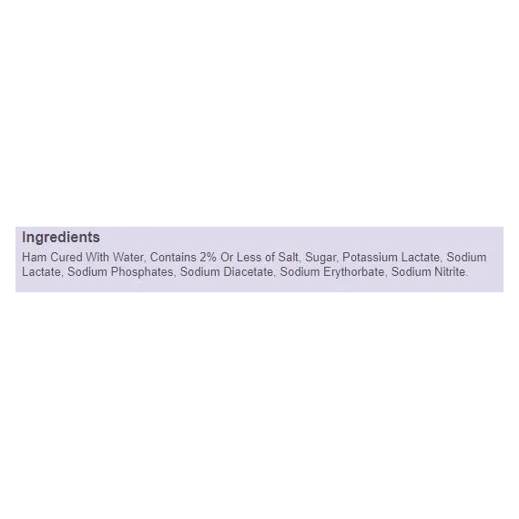 Details Ingredients Ham Cured With Water, Contains 2% Or Less of Salt, Sugar, Potassium Lactate, Sodium Lactate, Sodium Phosphates, Sodium Diacetate, Sodium Erythorbate, Sodium Nitrite. Show more Product features Our fully cooked Off the Bone deli ham is perfectly seasoned for a phenomenal flavor that everyone is sure to love. From company luncheons to quick weekday dinners, and all things in between, Eckrich deli meats are the ideal solution for mealtime. Perfectly Seasoned Lunch Meat - Our Off the Bone deli ham is perfectly seasoned so you can enjoy it sliced on your favorite sandwich or sub. Simple and Delicious Meal Solution - Eckrich deli meats are ideal for a quick weekday meal that is both simple and delicious. Eckrich Has You Covered - Whether you are providing cold cuts for a luncheon, or putting together quick family dinners, Eckrich deli meats have you covered. Amazing Flavor - Our products are crafted with just the right blend of spices for a truly rich, savory taste. Tradition of Taste and Excellence - Eckrich has been producing the best quality, flavorful deli meats since 1894. Allergy Notice Our stores may use some of the following ingredients: peanuts, eggs, soy, tree nuts, wheat, dairy products, fish, and/or shellfish. Even if these are not listed on the ingredient label, please be aware that all products may have come in contact with these ingredients.