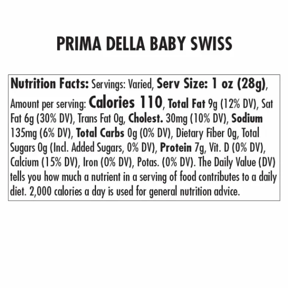 Details Ingredients Pasteurized Part-Skim Milk, Salt, Cheese Cultures, Enzymes. Contains: Milk And Milk Products. Product features Prima Della Baby Swiss cheese is made with all-natural milk. Derived from traditional Swiss cheese, Baby Swiss has numerous smaller 'eyes' than the original. Its mild taste and smooth, creamy texture distinguish it from other types of cheeses. When shredded, Baby Swiss melts well into a variety of different dishes. Excellent on sandwiches or cubed on a cheese tray! Made with all-natural milk Mild, slightly nutty taste Smooth, creamy texture Tasty for snacking and for use in recipes Sliced to order in store Allergy Notice Our stores may use some of the following ingredients: peanuts, eggs, soy, tree nuts, wheat, dairy products, fish, and/or shellfish. Even if these are not listed on the ingredient label, please be aware that all products may have come in contact with these ingredients. Special Features Premium flavor Net Quantity of Content 0 X 1 oz (28 G)