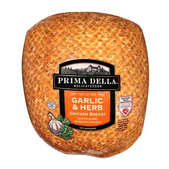 Details Ingredients Chicken Breast Meat, Water, Seasoning (Salt, Maltodextrin, Sugar, Dextrose, Rendered Chicken Fat, Dehydrated Chicken Broth, Spice Extractives), Contains 2% Or Less of Dextrose, Sodium Phosphate, Salt, Sodium Acetate, Sodium Diacetate, Coated With: Natural Smoke Flavor, Onion Powder, Garlic Powder, Brown Sugar, Dehydrated Carrot, Spices, Natural Flavor, Caramel Color, Extractives of Annatto. Show more Product features Prima Della Garlic & Herb Chicken Breast, Deli Sliced Prima Della Garlic & Herb Chicken breast: 98% fat free Delicatessen Coated with seasonings Made with whole chicken breast American Heart Association Certified Inspected for wholesomeness by U.S. Department of Agriculture Allergy Notice Our stores may use some of the following ingredients: peanuts, eggs, soy, tree nuts, wheat, dairy products, fish, and/or shellfish. Even if these are not listed on the ingredient label, please be aware that all products may have come in contact with these ingredients.