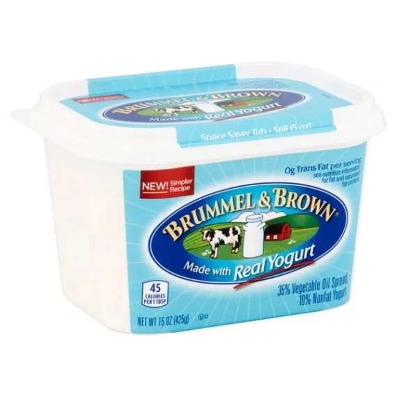 Details Ingredients Purified Water, Soybean Oil, Nonfat Yogurt* (Cultured Nonfat Milk), Palm Kernal and Palm Oil, Modified Tapioca Starch, Salt, Mono and Diglycerides, Potassium Sorbate (Used to Protect Quality), Lactic Acid, Lecithin (Soy), Natural Flavors, Vitamin A Palmitate, Beta Carotene (Color). Show more Product features Enjoy the sweet, creamy taste of Brummel & Brown buttery spread, made with the wholesome goodness of real yogurt. A smart and delicious choice with 1/2 the fat and calories of butter, no cholesterol and 0g trans fat per serving. Brummel & Brown has 50% less fat and calories than butter: one serving (1 tbsp.) of butter contains 100 calories, 11g total fat, 7g saturated fat, while Brummel & Brown contains 5g fat (1.5g saturated fat) and 45 calories per serving. Use in place of butter for all of your spreading, topping, cooking or even baking needs: perfect for spreading on toast, melting on vegetables, or sauteing chicken, fish or pork. Try one of our favorite recipes, available on BrummelAndBrown.com: Sauteed Cod over Warm Farro and Vegetable Salad, Braised Chicken with Baby Spinach & White Beans, Creamy Shrimp Risotto, or Halibut with Savory Lemon Shallot Sauce. Or, simply spread it on your breakfast toast, bagel, or English Muffin – with or without your favorite jam or jelly – to make your morning deliciously good. Made with 35% vegetable oil, it’s a tasty way to add flavor to your food that you can feel good about. Discover the pure deliciousness of Brummel & Brown buttery spread! Spread, 35% Vegetable Oil, 10% Nonfat Yogurt Made with real yogurt. 0 g trans fat per serving. See nutrition information for fat and saturated fat content. 45 calories per 1 tbsp. Space saver tub. Still 15 oz! New! Simpler recipe. 50% less fat & calories than butter. No cholesterol per serving. Per Serving: Brummel & Brown: 5 g fat; 45 cal; 0 mg chol. Butter: 11 g fat; 100 cal; 30 mg chol. Gluten free. No partially hydrogenated oils. Questions or comments? Call 1-800-579-3663 or visit us at BrummelAndBrowncom. Special Features 100% less cholesterol than butter Net Quantity of Content 30 X 1 Tbsp