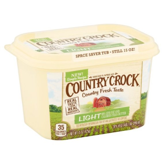 Details Ingredients Purified Water, Soybean Oil, Palm Kernel and Palm Oil, Salt, Mono and Diglycerides, Natural Flavors, Lecithin (Soy), Vinegar, Vitamin A Palmitate, Betacarotene (Color), Vitamin D3. Show more Product features Vegetable Oil Spread, Light, Tub 15 OZ Country fresh taste. 50% less fat & calories than butter. Contains essential fats for healthy growth & development (Contains 280 mg of omega 3 ALA per serving, which is 17% of the 1.6 g daily value for ALA and 2200 mg of Omega 6 LA per serving.). No hydrogenated oil. No trans fat (5 g fat [1.5 g saturated fat], 0 g trans fat per serving). No cholesterol per serving. Contains 50% fewer calories & fat than butter. Per Serving: CC Light: 5 g fat; 1.5 g sat. fat; 50 cal; 0 mg chol. Per Serving: Butter: 11 g fat; 7 g sat fat; 100 cal; 30 mg chol. Gluten free. Did you know? The delicious goodness of Country Crock Light contains essential fats, omega 3 ALA and omega 6 LA, for kids' healthy growth and development. Plus, it's a good source of vitamins A & D. Nurture your family by serving meals that include a variety of fruits, vegetables, whole grain foods and fat-free or low-fat dairy. And for children over 4, a balanced diet also includes a range of 25% - 35% of calories from fat. Refrigerate for quality. Contains milk (whey) and soy. 15 oz (425 g) Englewood Cliffs, NJ 07632 800-579-3663 Unilever 39% Vegetable Oil Spread, Light Country fresh taste. 50% less fat & calories than butter. Contains essential fats for healthy growth & development (Contains 280 mg of omega 3 ALA per serving, which is 17% of the 1.6 g daily value for ALA and 2200 mg of Omega 6 LA per serving.). No hydrogenated oil. No trans fat (5 g fat [1.5 g saturated fat], 0 g trans fat per serving). No cholesterol per serving. Contains 50% fewer calories & fat than butter. Per Serving: CC Light: 5 g fat; 1.5 g sat. fat; 50 cal; 0 mg chol. Per Serving: Butter: 11 g fat; 7 g sat fat; 100 cal; 30 mg chol. Gluten free. Did you know? The delicious goodness of Country Crock Light contains essential fats, omega 3 ALA and omega 6 LA, for kids' healthy growth and development. Plus, it's a good source of vitamins A & D. Nurture your family by serving meals that include a variety of fruits, vegetables, whole grain foods and fat-free or low-fat dairy. And for children over 4, a balanced diet also includes a range of 25% - 35% of calories from fat. Special Features No trans fat Net Quantity of Content 30 X 1 Tbsp