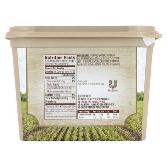 Details Ingredients Purified Water, Soybean Oil, Palm Kernel and Palm Oil, Salt, Lecithin (Soy), Vinegar, Natural Flavors, Vitamin A Palmitate, Beta Carotene (Color), Vitamin D3. Show more Product features Country Crock Original Buttery Spread has a delicious country fresh taste made from real, simple ingredients your whole family will enjoy. This tasty spread is made from ingredients like a blend of delicious oils, purified water, and a pinch of salt with no artificial flavors or preservatives, 0g of trans-fats and no cholesterol per serving. Whether Country Crock is a part of your family mealtimes, or a quick breakfast on-the-go, it makes everything taste delicious! Country Crock has 70% less saturated fat than butter, and only 50 calories per serving. This delicious butter substitute contains no partially hydrogenated oils and is made with simple, high quality ingredients you can feel good about serving your family. Country Crock Original is also a good source of Omega 3-ALA and Omega 6-LA, essential fats which help support kids? normal growth and development. Vegetable Oil Spread, 40%, Original Space saver tub. Real taste from real ingredients. Country fresh taste. No artificial flavors. No artificial preservatives. 0 g trans fat per serving (See nutrition information for fat and saturated fat content). 50 calories per 1 tbsp. Gluten free. No artificial preservatives. 0 g trans fat per serving. No partially hydrogenated oils. No cholesterol per serving. Ingredients you can recognize and pronounce. Per Serving: Country Crock: 6 g fat; 1.5 g sat fat; 50 cal.; 0 mg chol.. Butter: 11 g fat; 7 g sat. fat; 100 cal.; 30 mg chol. Please recycle. Discover more about our products at Learnaboutmyfood.com. Questions or comments? Call 1-800-579-3663. To learn more about how to care for your tub, visit us at CountryCrock.com. Special Features No trans fat Net Quantity of Content 91 X 1 Tbsp