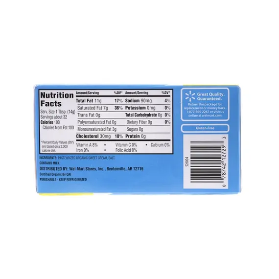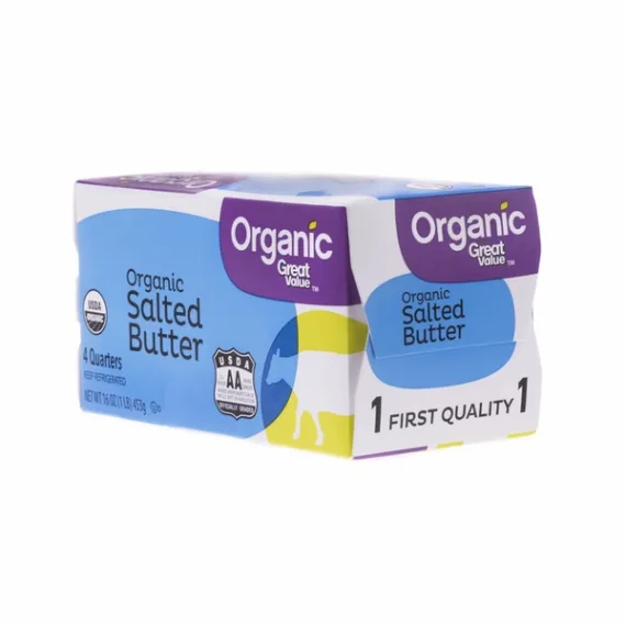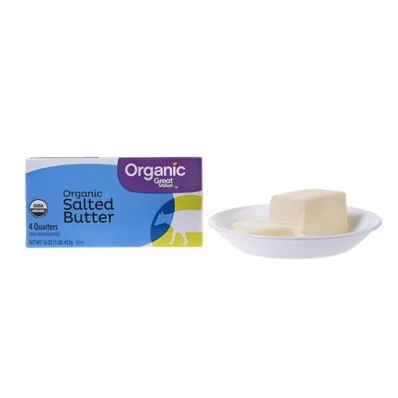 Details Ingredients Pasteurized Organic Sweet Cream, Salt Product features Intensify the flavor of any meal when you add Great Value Organic Salted Butter. This all-purpose butter is an everyday staple— it’s perfect for spreading, topping and including in all of your favorite dishes. From ensuring your chocolate chip cookies bake to perfection to adding it in with eggs to create the perfect fluffy cake, this butter is a vital ingredient when it comes to preparing your next masterpiece. Stock your kitchen with this fresh, premium butter and get ready for the wonderfully light texture and subtle flavor of Great Value Organic Salted Butter to transform your next dish. Pick some up today! Great Value products provide families with affordable, high quality grocery and household consumable options. With our wide range of product categories spanning grocery and household consumables, we offer you a variety of products for your family's needs. Our products are conveniently available online and in Walmart stores nationwide, allowing you to stock up and save money at the same time Great Value Organic Salted Butter, 16 oz: Perfect for spreading, topping and including in all of your favorite dishes Light texture and subtle flavor Includes Pasteurized Organic Sweet Cream, Salt Net Quantity of Content 32 X 1 Tbsp.