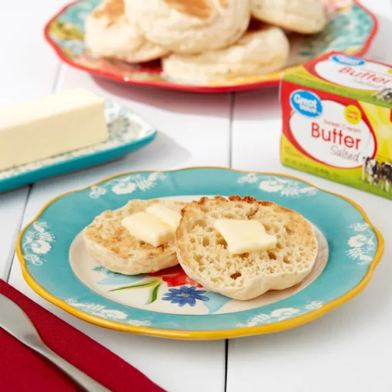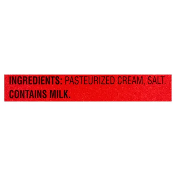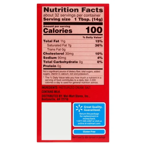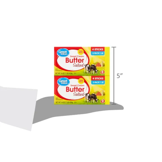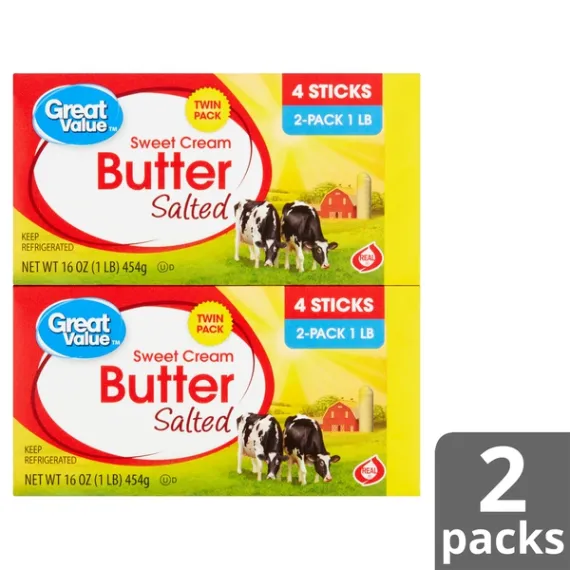Details Ingredients CREAM, SALT. Product features Great Value Salted Sweet Cream Butter Twin Pack is a must-have kitchen essential for any home chef. The perfect blend of creamy, salty, and savory, this butter is delicious on top of waffles, pancakes, or toast. Use it to baste pan-seared steak or grill sandwiches to take your lunch or dinner up a notch. You can also use it to bake bread or as a condiment on freshly grilled vegetables. Take comfort in knowing our butter has earned the REAL® Seal, assuring you are buying a genuine dairy product. Take any meal to the next level when you add Great Value Salted Sweet Cream Butter Twin Pack. Great Value products provide families with affordable, high quality grocery and household consumable options. With our wide range of product categories spanning grocery and household consumables, we offer you a variety of products for your family's needs. Our products are conveniently available online and in Walmart stores nationwide, allowing you to stock up and save money at the same time. Salted sweet cream butter Twin pack -- (2) packages of 4 sticks each Kosher Gluten-free 100 calories per serving USDA officially graded AA Net Quantity of Content ABOUT 32 X 1 Tbsp