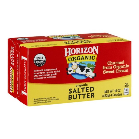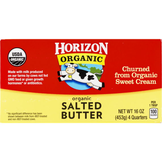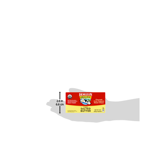 Details Ingredients Organic Grade A Pasteurized Sweet Cream (Milk), Salt. Product features The delicious Horizon dairy products your family loves come from a partnership with over 600 organic family farmers. From sunny California to the rolling hills of upstate New York, local farming families are the heart of Horizon. Enjoy Horizon Organic Salted Butter. Delicious in recipes or simply spread on bread, Horizon organic salted and unsalted butter taste so good because they start with fresh, sweet organic cream. Horizon Organic Salted Butter Sticks, 16oz., 4 count: USDA Organic Churned from organic sweet cream 1st quality Special Features Without antibiotics Net Quantity of Content ABOUT 32 X 1 Tbsp
