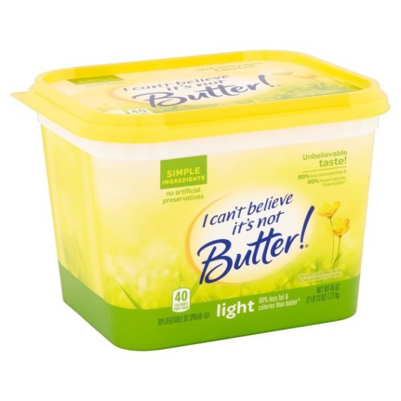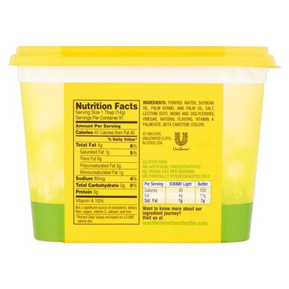 Details Ingredients Purified Water, Soybean Oil, Palm Kernel and Palm Oil, Salt, Lecithin (Soy), Mono and Diglycerides,Vinegar, Natural Flavors, Vitamin A Palmitate, Beta Carotene (Color). Show more Product features Vegetable Oil Spread, Light, Tub 45 OZ 60% less fat & calories than butter (See nutrition information for fat and saturated fat content). Simple ingredients. No artificial preservatives. Unbelievable taste! 80% less saturated fat & 60% fewer calories than butter (See nutrition information for fat and saturated fat content). 40 calories per 1 tbsp. Gluten free. No artificial preservatives. 0 g trans fat per serving. No partially hydrogenated oils. Per Serving: ICBINB! Light: 40 calories; 4 g fat; 1 g sat. fat. Butter: 100 calories; 11 g fat; 7 g sat. fat. Want to know more about our ingredient journey? Visit us at icantbelieveitsnotbutter.com. Questions or comments? Call 1-800-634-0302. Visit us at icantbelieveitsnotbutter.com. Keep refrigerated. For best quality do not freeze. Best if used by date on lid. 45 oz (2 lb 13 oz) 1.27 kg Englewood Cliffs, NJ 07632 800-634-0302 Unilever Vegetable Oil Spread, 30%, Light 60% less fat & calories than butter (See nutrition information for fat and saturated fat content). Simple ingredients. No artificial preservatives. Unbelievable taste! 80% less saturated fat & 60% fewer calories than butter (See nutrition information for fat and saturated fat content). 40 calories per 1 tbsp. Gluten free. No artificial preservatives. 0 g trans fat per serving. No partially hydrogenated oils. Per Serving: ICBINB! Light: 40 calories; 4 g fat; 1 g sat. fat. Butter: 100 calories; 11 g fat; 7 g sat. fat. Want to know more about our ingredient journey? Visit us at icantbelieveitsnotbutter.com. Questions or comments? Call 1-800-634-0302. Visit us at icantbelieveitsnotbutter.com. Special Features Light Net Quantity of Content 91 X 1 Tbsp