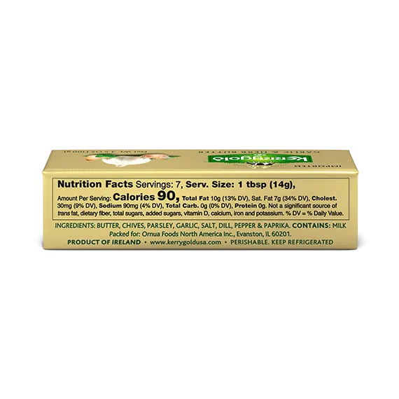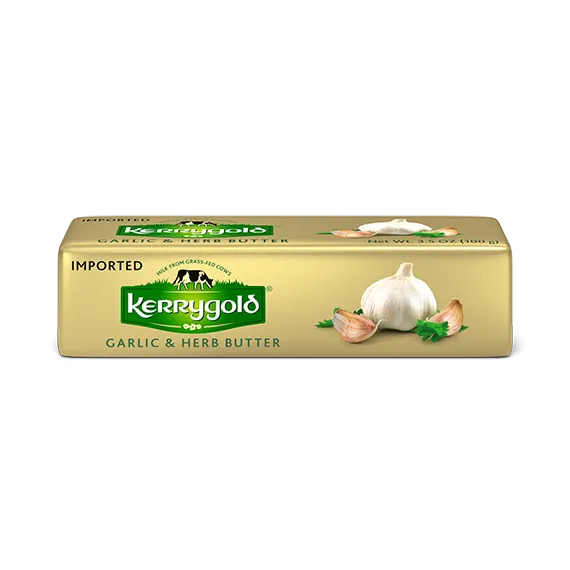 Details Ingredients BUTTER, CHIVES, PARSLEY, GARLIC, SALT, DILL, PEPPER & PAPRIKA. Product features Kerrygold Garlic & Herb Butter is crafted from Kerrygold Pure Irish Butter, laced with classic fresh herbs like chives and parsley, a touch of garlic and a sprinkling spices. It’s an exquisite finishing butter--melt over sizzling steak, grilled shrimp, or roasted vegetables just before serving. Or use it as an ingredient to make the most scrumptious garlic bread or buttered noodles. All Kerrygold dairy products, imported from Ireland, are made with milk from grass-fed cows that are raised the natural way—free of growth hormones and nurtured on small Irish farms. Imported from Ireland Milk from grass-fed cows No artificial growth hormones* Seasoned, herbed butter Use as a topping or in cooking One 3.5oz stick Net Quantity of Content 7 X 1 Tbsp