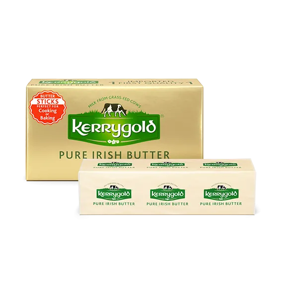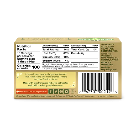 Details Ingredients Pasteurized Cream, Salt. Contains: Milk. Product features Kerrygold Salted Pure Irish Butter Sticks provide the same superior flavor and performance of Kerrygold Pure Irish Butter, but in American-size, 4-ounce sticks for easier measuring. The butter sticks are naturally golden, with a seductively creamy flavor and a long, lingering finish. They work beautifully in recipes calling for regular salted butter, adding velvety richness to sauces and buttery tenderness to baked goods. All Kerrygold dairy products, imported from Ireland, are made with milk from grass-fed cows that are raised the natural way—free of growth hormones and nurtured on small Irish farms. Salted, sweet cream butter Two salted butter 4oz sticks per package Kerrygold Salted Butter has 100 calories per serving No additives or preservatives Source of vitamin A Imported from Ireland No growth hormones. Milk from grass-fed cows. Net Quantity of Content 16 X 1 Tbsp