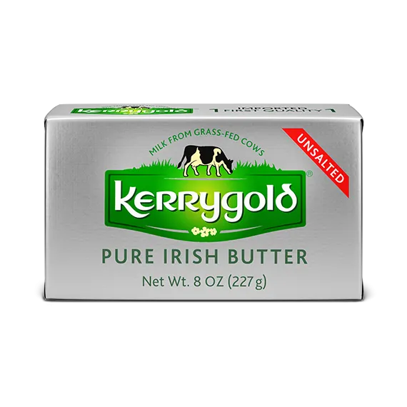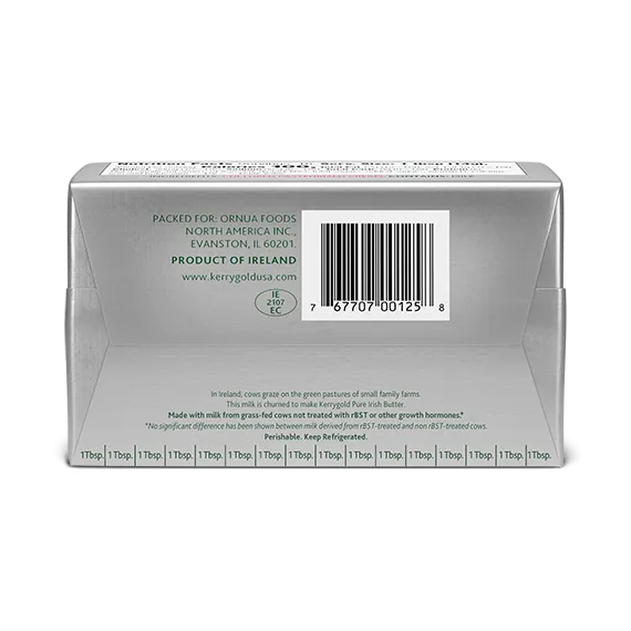 Details Ingredients Cultured Pasteurized Cream Product features Kerrygold Unsalted Pure Irish Butter Made with cultured cream for complex, nuanced flavor, the natural golden color is the result of beta-carotene in the milk of grass-fed cows. Foil wrapping preserves freshness and premium quality. Make browned butter sauces, super-rich pound cakes and golden crusts. All Kerrygold dairy products, imported from Ireland, are made with milk from grass-fed cows that are raised the natural way, without growth hormones, and roaming free on small Irish farms Imported from Ireland Cultured cream for nuanced flavor. Foil-wrapped for freshness. Milk from grass-fed cows. No growth hormones. Net Quantity of Content 16 X 1 Tbsp