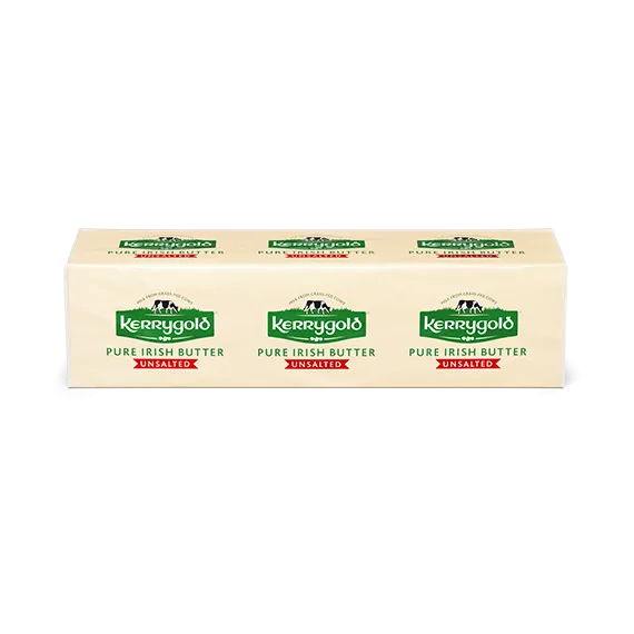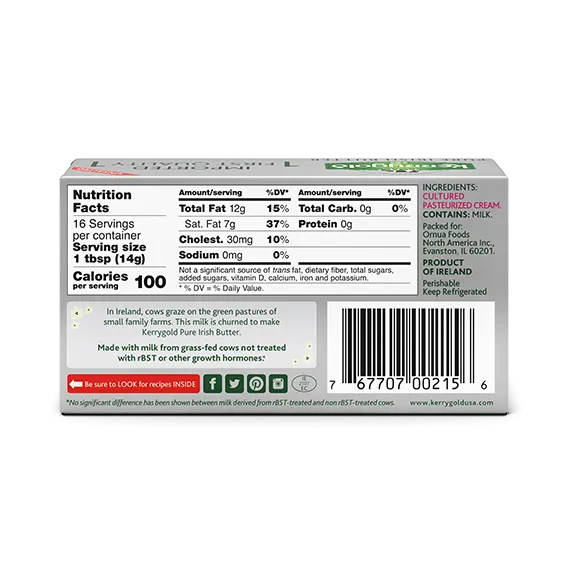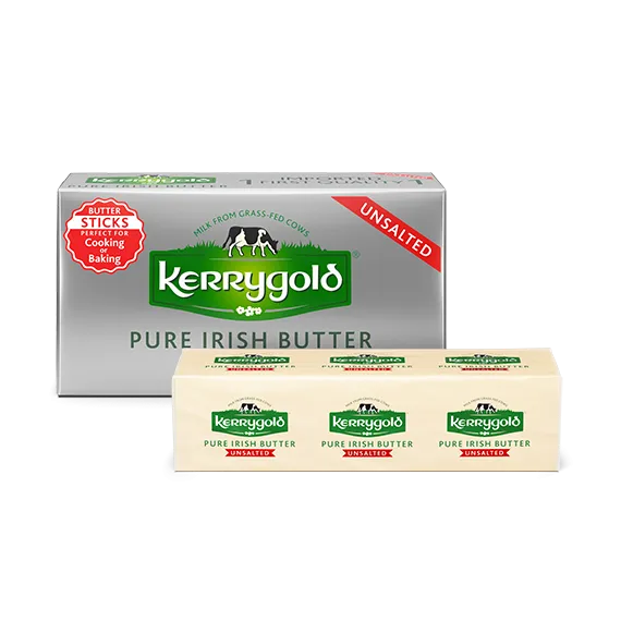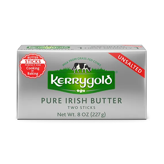 Details Ingredients Cultured Pasteurized Cream. Contains: Milk. Product features Kerrygold Unsalted Sticks provides the same superior flavor and performance of Kerrygold Pure Irish Unsalted Butter, but in American-size, 4-ounce sticks for easier measuring. The butter sticks are naturally golden, with a seductively creamy flavor and a long, lingering finish. They work beautifully in recipes calling for unsalted butter, adding velvety richness to sauces and buttery tenderness to baked goods. All Kerrygold dairy products, imported from Ireland, are made with milk from grass-fed cows that are raised the natural way—free of growth hormones and nurtured on small Irish farms. Unsalted, cultured cream butter. American-size, two 4-ounce sticks. Imported from Ireland. Milk from grass-fed cows. No growth hormones. Net Quantity of Content 16 X 1 Tbsp