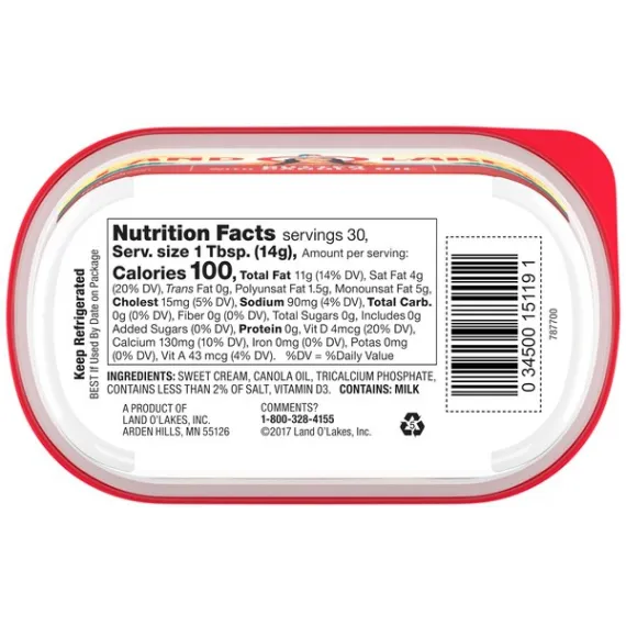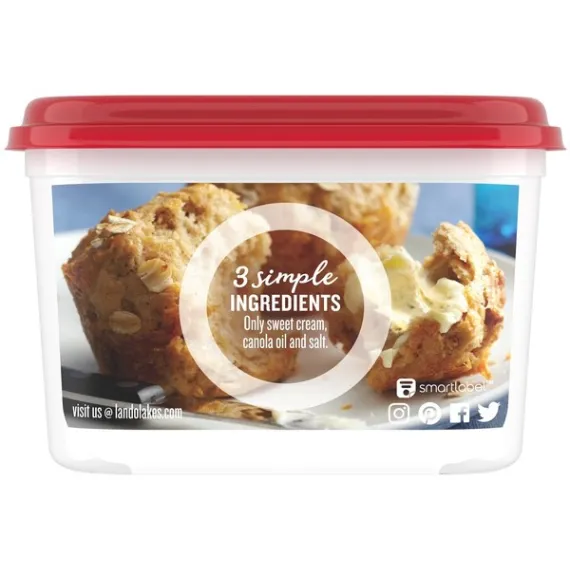 Details Ingredients Sweet Cream, Canola Oil, Tricalcium Phosphate, contains less than 2% of Salt, Vitamin D3. Product features Spread it onto warm waffles, spoon it onto steamed veggies, or use it to top a golden baked potato. Made with only sweet cream, canola oil and salt, Land O Lakes Butter with Canola Oil is made with the butter you love and has the spreadable convenience you want, right out of the refrigerator. One 15 oz container of butter with canola oil Made with only 3 simple ingredients: sweet cream, canola oil, and salt Spreadable right out of the refrigerator Great for spreading, topping, and cooking Delicious butter made easier to spread with canola oil Special Features Sweet cream Net Quantity of Content 30 X 1 Tbsp