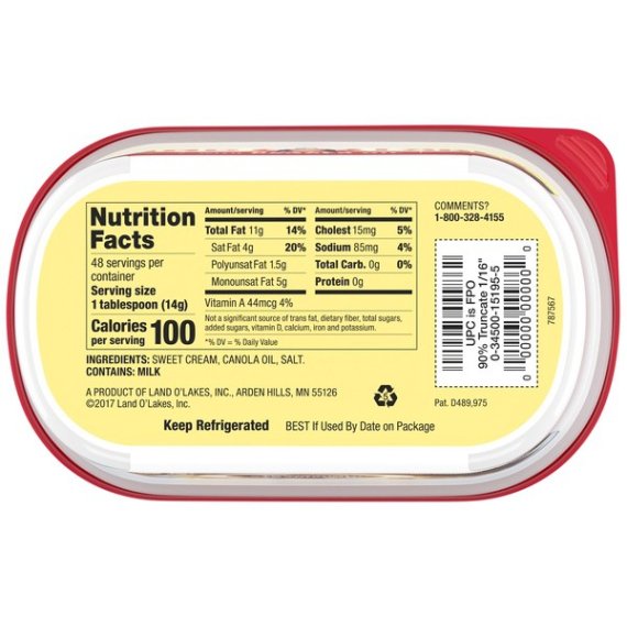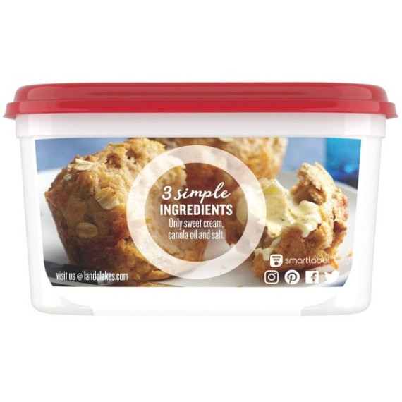 Details Ingredients Sweet Cream, Canola Oil, Salt. Contains: Milk Product features Spread it onto warm waffles, spoon it onto steamed veggies, or use it to top a golden baked potato. Made with only sweet cream, canola oil and salt, Land O Lakes Butter with Canola Oil is made with the butter you love and has the spreadable convenience you want, right out of the refrigerator. Land O Lakes Butter with Canola Oil, 24 oz.: One 24 oz container of butter with canola oil Made with only 3 simple ingredients: sweet cream, canola oil, and salt Spreadable right out of the refrigerator Great for spreading, topping, and cooking Delicious butter made easier to spread with canola oil Net Quantity of Content 48 X 1 Tbsp