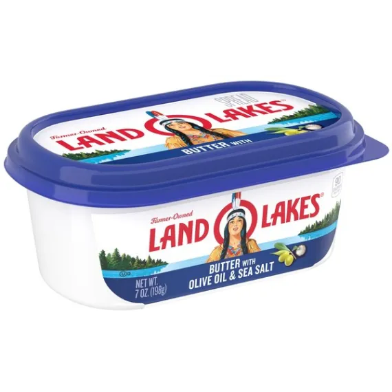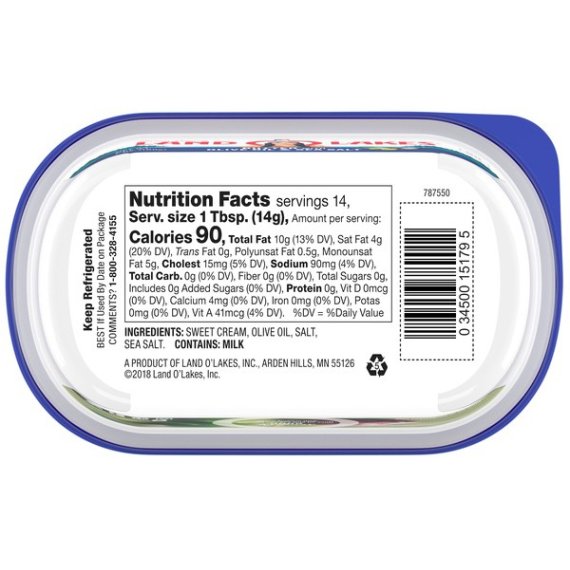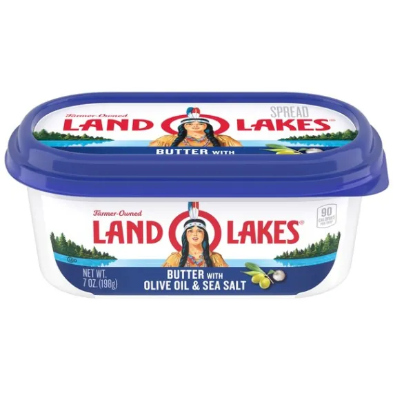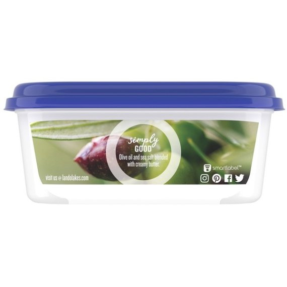 Details Ingredients Ingredients: Sweet Cream, Olive Oil, Salt, Sea Salt. Contains: Milk Product features Perfect for sautéing your main course or enhancing sweet cinnamon rolls, Land O Lakes Butter with Olive Oil & Sea Salt is the rich creaminess of the butter you love, with the goodness of olive oil. It's spreadable straight from the refrigerator and made with simple ingredients. Land O Lakes Butter with Olive Oil & Sea Salt: One 7 oz container of butter with olive oil and sea salt Simply Good. Olive Oil and Sea Salt blended with creamy butter Simple ingredients: sweet cream, olive oil, salt, and sea salt Spreadable right out of the refrigerator Great for spreading, topping, and cooking Special Features Great for spreading and cooking Net Quantity of Content 14 X 1 Tbsp