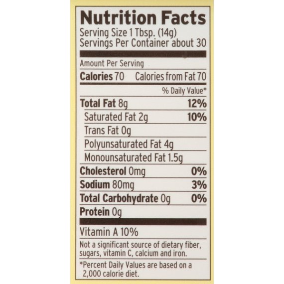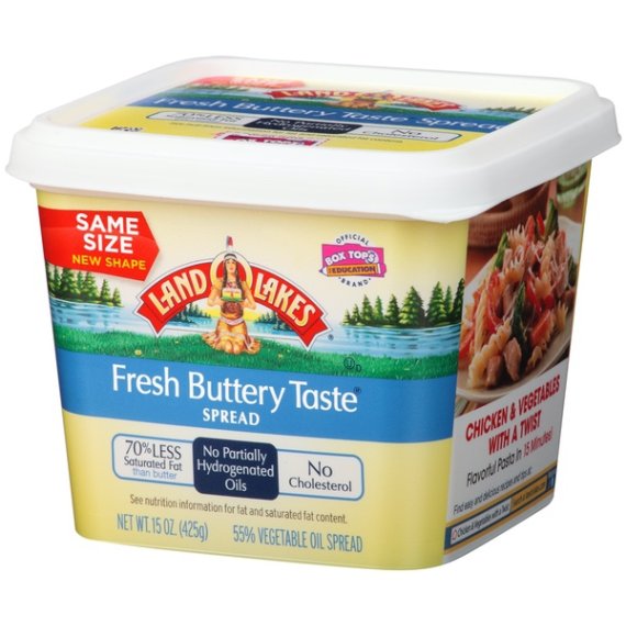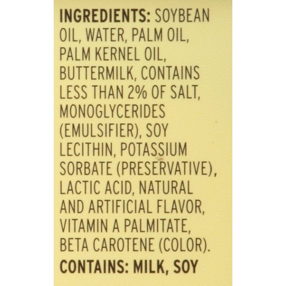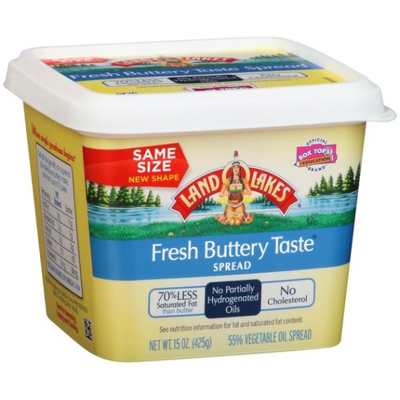 Details Ingredients Soybean Oil, Water, Palm Oil, Palm Kernel Oil, Buttermilk, contains less than 2% of Salt, Monoglycerides (Emulsifier), Soy Lecithin, Potassium Sorbate (Preservative), Lactic Acid, Natural and Artificial Flavor, Vitamin A Palmitate, Beta Carotene (Color). Show more Product features Fresh asparagus. Sizzling salmon. Fresh baked bread. Land O Lakes Fresh Buttery Taste® Spread provides extra flavor to your favorite foods, but with 70% less saturated fat than butter, zero cholesterol, and 0g trans-fat per serving. One 15 oz container of spread 70% less saturated fat than regular butter No cholesterol Excellent source of ALA Omega 3 Fatty Acids Great for spreading and topping Net Quantity of Content ABOUT 30 X 1 Tbsp