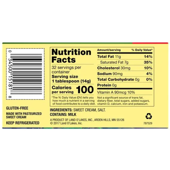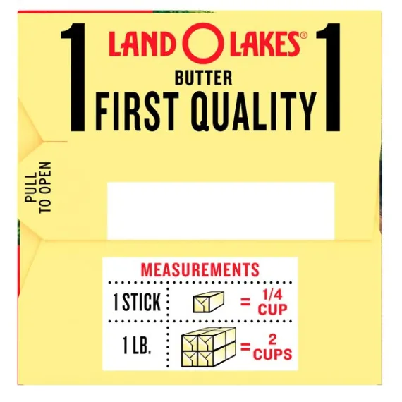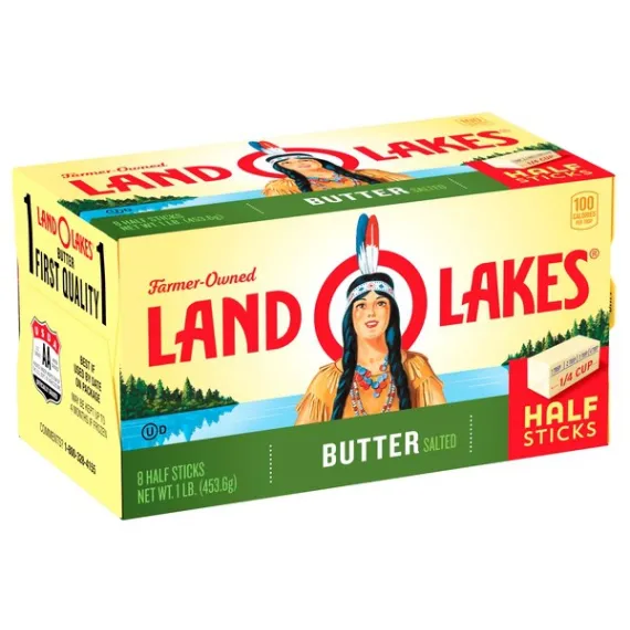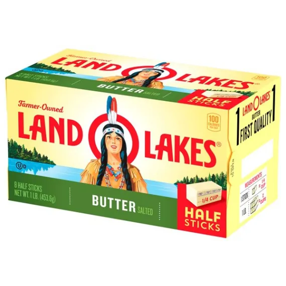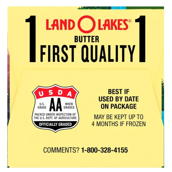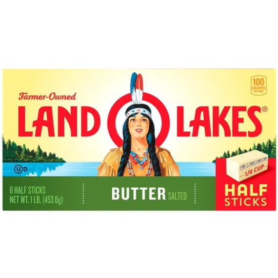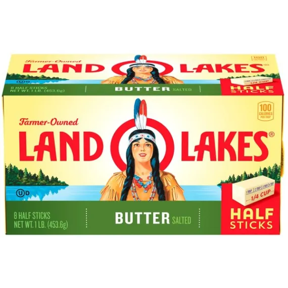 Details Ingredients Sweet Cream, Salt. Contains: Milk Product features Land O Lakes Salted Butter in Half Sticks is the all-purpose butter you love and trust, but in premeasured, easy-to-use half sticks. They're individually wrapped in the FlavorProtect® Wrapper to keep your butter tasting fresher longer. Plus, smaller half sticks mean you get freshly opened butter more often. LAND O LAKES® Butter Half Sticks Salted - 8 CT. 1 first quality. Measurements:1 stick = 1/4 cup. 1 lb = 2 cups. USDA, U.S. Grade AA when graded. Packed under inspection of the U.S. Dept. of Agriculture, officially graded. The butter you love in half sticks. Only from Land O'Lakes, a convenient, pre-measured half-stick size that's individually wrapped to keep your butter tasting fresher longer. Only Land O'Lakes® butter has the FlavorProtect® wrapper to keep other flavors out and the fresh taste you love in. Find easy and delicious recipes and tips at:Bacon, tomato, avocado quesadilla/search at landolakes.com. Where Simple Goodness Begins®. Gluten-free. Made with pasteurized sweet cream. Satisfaction guaranteed. Your comments are important! Call 1-800-328-4155. Visit our web site at: www.landolakes.com. ©2015 Land O' Lakes, Inc. Box Tops for Education and associated words and designs are trademarks of General Mills, used under license. ©General Mills. Special Features Salted Net Quantity of Content 32 X 1 Tbsp
