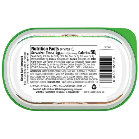 Details Ingredients Water*, Butter (Cream, Salt), Canola Oil*, Buttermilk*, contains less than 2% of Food Starch-Modified*, Tapioca Maltodextrin*, Salt, Mono and Diglycerides*and PGPR* (Emusifiers), Lactic Acid*, Potassium Sorbate and Sodium Benzoate* (To Preserve Freshness), Natural Flavor*, Xanthan Gum*, Beta- Carotene* (Color). Show more Product features Drizzle it onto steamed veggies, or spread it across whole grain pancakes. The creamy flavor of Land O Lakes Light Butter with Canola Oil has 50% less fat and calories, and less cholesterol than regular butter giving you a light way to enjoy all your favorite foods. It's spreadable and ready to use right out of the refrigerator. One 8 oz container of light butter with canola oil Great butter taste with 50% less fat and calories than regular butter 60% less cholesterol than butter Spreadable right from the refrigerator Great for spreading and topping Special Features Light butter with canola oil Net Quantity of Content 16.0 X 1 Tbsp