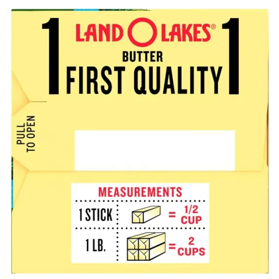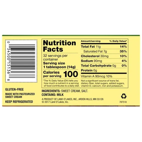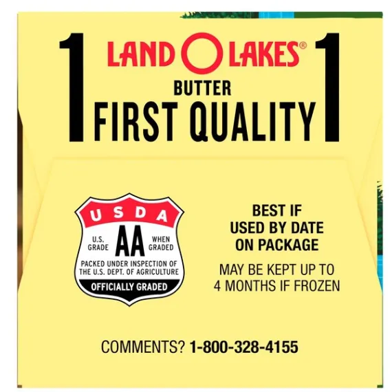 Details Ingredients Ingredients: Sweet Cream, Salt. Contains: Milk Product features Melted, browned, or clarified, Land O Lakes Salted Butter is the all-purpose butter that improves the taste of everything it touches. It's the original sweet cream butter that never lets your taste buds down. Every stick has the FlavorProtect® Wrapper to protect the fresh dairy flavor you know and love. 1 pound of salted butter in 4 sticks (1/2 cup each) Only two ingredients: sweet cream and salt FlavorProtect® Wrapper that keeps other flavors out and fresh taste in Great for cooking, baking, spreading, and topping From Land O'Lakes, a farmer-owned cooperative since 192 Gluten free Kosher Special Features Salted Net Quantity of Content 32 X 14 g