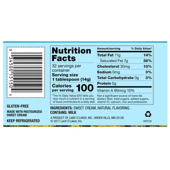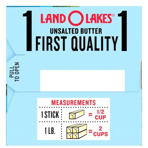Details Ingredients Ingredients: Sweet Cream, Natural Flavoring. Contains: Milk Product features Precision is crucial for correctly balancing flavors – whether it be baked in rich pecan pie, browned butter pound cake or classic chocolate chip cookies. Land O Lakes Unsalted Butter has no added salt so you get the fresh, sweet cream taste you love and the flavor control you need when baking, cooking or topping. 1 pound of unsalted butter in 4 sticks (1/2 cup each) No salt added Provides the flavor control you need for baking and cooking FlavorProtect® Wrapper that keeps other flavors out and fresh taste in From Land O'Lakes, a farmer-owned cooperative since 1921 Special Features Sweet cream Net Quantity of Content 32 X 1 Tbsp