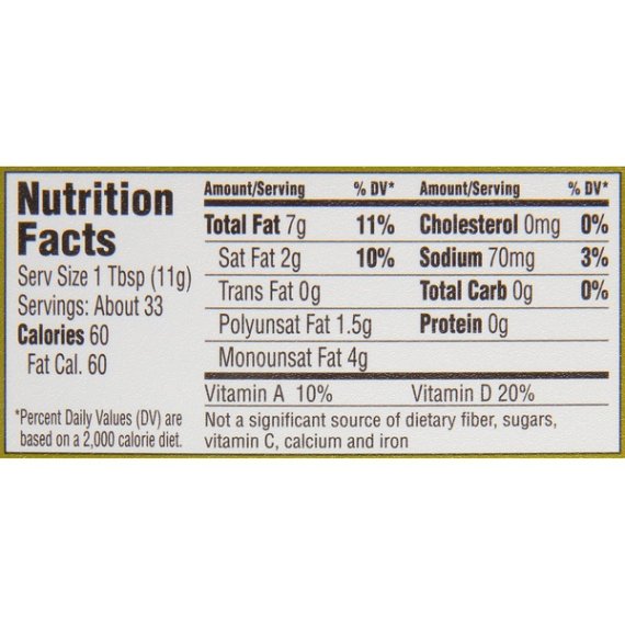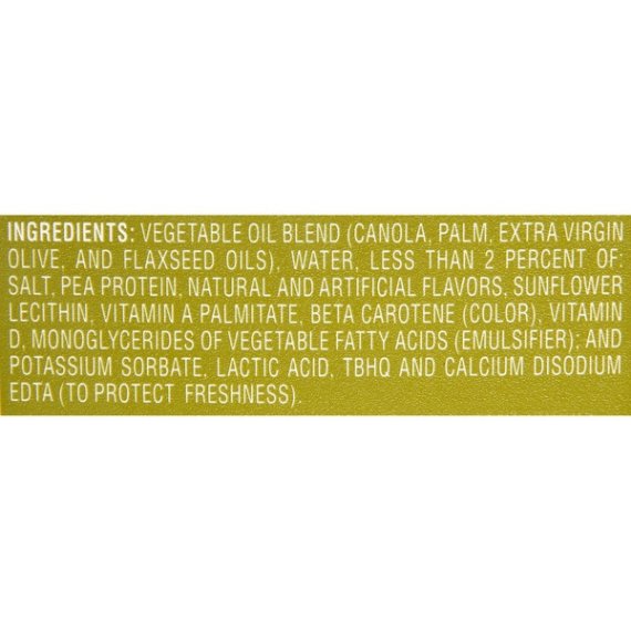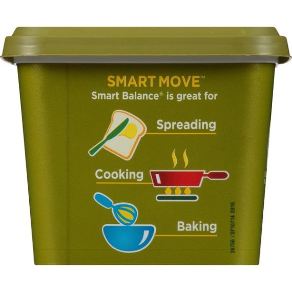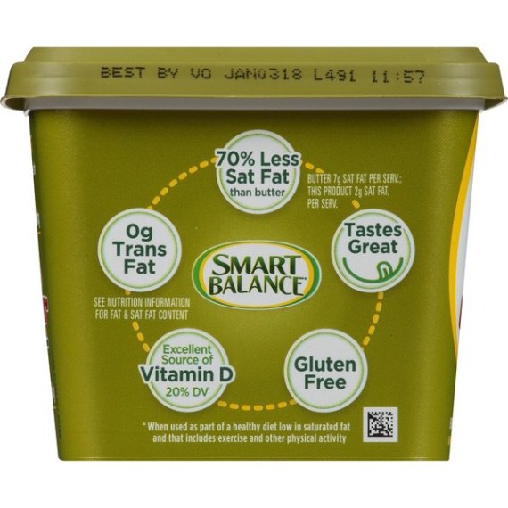 Details Ingredients Vegetable Oil Blend (Canola, Palm, Extra Virgin Olive, and Flaxseed Oils), Water, less than 2 percent of: Salt, Pea Protein, Natural and Artificial Flavors, Sunflower Lecithin, Vitamin A Palmitate, Beta Carotene (Color), Vitamin D, Monoglycerides of Vegetable Fatty Acids (Emulsifier); and Potassium Sorbate, Lactic Acid, TBHQ and Calcium Disodium EDTA (To Protect Freshness). Show more Product features Buttery Spread, Extra Virgin Olive Oil, Tub 13 OZ 64% vegetable oils. Supports healthy cholesterol levels (When used as part of a health diet low in saturated fat and that includes exercise and other physical activity) already in the normal range. 320 mg omega-3 ALA per serving. See nutrition information for fat & sat fat content. Based on 1 Tbsp Serving Size: Smart Balance: 60 calories; 2 g sat fat; 0 g animal sat fat; 2 g plant-based sat fat; 0 mg cholesterol; cooking. Butter: 100 calories; 7 g sat fat; 7 g animal sat fat 0 g plant-based sat fat; 30 mg cholesterol; cooking. Smart Move: Smart Balance is great for spreading; cooking; baking. 70% less fat than butter - butter 7 g sat fat per serv; this product 2 g sat fat per serv; tastes great; gluten free; excellent source of vitamin D (20%); 0 g trans fat - see nutrition information for fat & sat fat content. smartbalance.com. Excellent source of omega-3 ALA. Contains 320 mg ALA per serv, which is 20% of the 1.6 g DV for ALA. Clinical research has shown that the right blend of fats may improve your cholesterol ratio when at least 2/3 of your fat intake comes from this product or a properly balanced diet. Limit total fat to about 30% of calories (65 g per day); saturated fat to 10% of calories (20 g per day); and dietary cholesterol to 300 mg per day. Avoid trans fats. Regular exercise is essential. Visit: SmartBalance.com for great tips and recipes. Facebook. Twitter. Pinterest. how2recycle.info. Not recycled in all communities. Keep refrigerated. Firm out of refrigeration, softens quickly. Okay to freeze. 13 oz (368 g) Cherry Hill, NJ 08003-3620 800-562-3062 2016 Pinnacle Food Group LLC Buttery Spread, Made with Extra Virgin Olive Oil 64% vegetable oils. Supports healthy cholesterol levels (When used as part of a health diet low in saturated fat and that includes exercise and other physical activity) already in the normal range. 320 mg omega-3 ALA per serving. See nutrition information for fat & sat fat content. Based on 1 Tbsp Serving Size: Smart Balance: 60 calories; 2 g sat fat; 0 g animal sat fat; 2 g plant-based sat fat; 0 mg cholesterol; cooking. Butter: 100 calories; 7 g sat fat; 7 g animal sat fat 0 g plant-based sat fat; 30 mg cholesterol; cooking. Smart Move: Smart Balance is great for spreading; cooking; baking. 70% less fat than butter - butter 7 g sat fat per serv; this product 2 g sat fat per serv; tastes great; gluten free; excellent source of vitamin D (20%); 0 g trans fat - see nutrition information for fat & sat fat content. smartbalance.com. Excellent source of omega-3 ALA. Contains 320 mg ALA per serv, which is 20% of the 1.6 g DV for ALA. Clinical research has shown that the right blend of fats may improve your cholesterol ratio when at least 2/3 of your fat intake comes from this product or a properly balanced diet. Limit total fat to about 30% of calories (65 g per day); saturated fat to 10% of calories (20 g per day); and dietary cholesterol to 300 mg per day. Avoid trans fats. Regular exercise is essential. Visit: SmartBalance.com for great tips and recipes. Facebook. Twitter. Pinterest. how2recycle.info. Not recycled in all communities. Special Features Extra adhesive tabs Net Quantity of Content ABOUT 33 X 1 Tbsp
