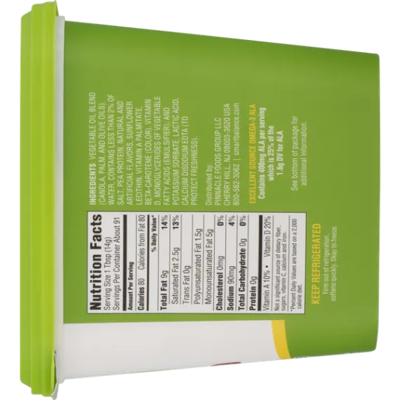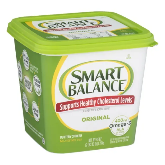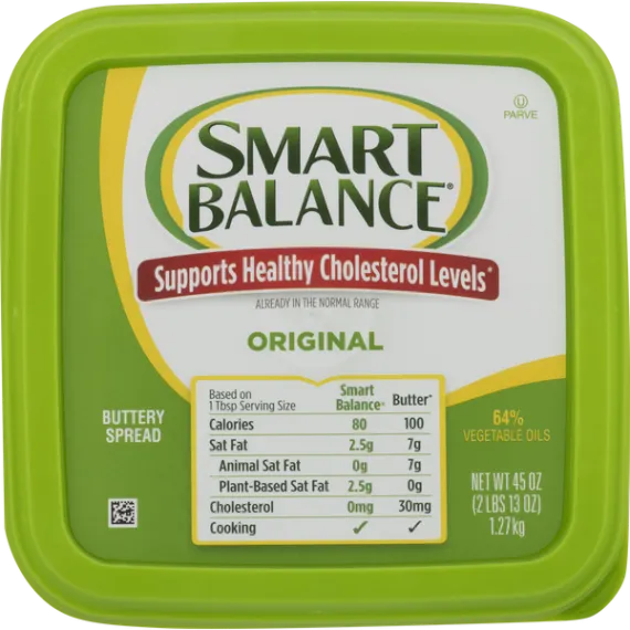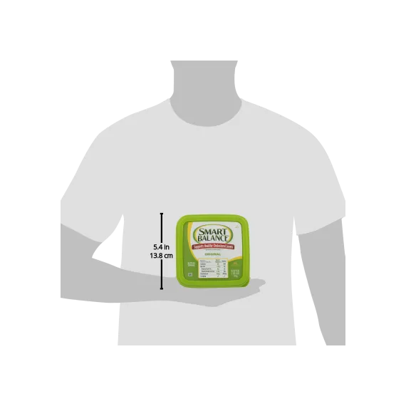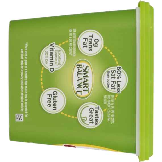 Details Ingredients Vegetable Oil Blend (Canola, Palm and Olive Oils), Water, contains less than 2% of Salt, Pea Protein, Natural and Artificial flavors, Sunflower Lecithin, Vitamin A Palmitate, Beta-Carotene (Color), Vitamin D, Monoglycerides of Vegetable Fatty Acids (Emulsifier), and Potassium Sorbate, Lactic Acid, Calcium Disodium EDTA (To Protect Freshness) Show more Product features Buttery Spread, Original, Tub 45 OZ Imitation butter (because it's dairy free). It's dairy free butter. Now use it like butter. Supports healthy cholesterol levels already in the normal range. Non GMO pledge (We pledge that 100% of ingredients in this Smart Balance product are non-GMO). 70% vegetable oils. Cook. Bake. Spread. Love. Based on 1 Tbsp Serving Size: Smart Balance: 90 calories; 2.5 g sat fat; 0 g animal sat fat; 2.5 g plant-based sat fat; 0 mg cholesterol; cooking. Butter: 100 calories; 7 g sat fat; 7 g animal sat fat; 0 g plant-based sat fat; 30 mg cholesterol; cooking. Ingredients with smarts. Clinical research has proven the right blend of fats may improve your cholesterol ratio when at least 2/3 of your fat intake comes from this product of our food plan. Limit total fat to about 30% of calories [65 g per day]; saturated fat to 10% of calories [20 g per day]; and dietary cholesterol to 300 mg per day. Avoid trans fats. Regular exercise is essential. For tips on how to balance the fats in your diet, see our food plan at SmartBalance.com. Who needs butter when there's Smart Balance? Now use our improved blend for all your butter needs - cook. Bake. Spread. Love. 60% less saturated fat than butter and now, 100% dairy-free ingredients. Butter 7 g sat fat; this product 2.5 g sat fat. Dairy free. Non-GMO. 0 g trans fat. 350 mg omega-3 ALA. See nutrition information for fat & sat fat content. smartbalance.com. boulderbrands.com. Gluten-free. Gelatin-free. Expeller-pressed oils. Keep refrigerated. Firm out of refrigeration, softens quickly. Okay to freeze. 45 oz (2 lb 13 oz) 1.27 kg Boulder, CO 80302 201-421-3970 2015 GFA Brands, Inc. Imitation Butter, Original Imitation butter (because it's dairy free). It's dairy free butter. Now use it like butter. Supports healthy cholesterol levels already in the normal range. Non GMO pledge (We pledge that 100% of ingredients in this Smart Balance product are non-GMO). 70% vegetable oils. Cook. Bake. Spread. Love. Based on 1 Tbsp Serving Size: Smart Balance: 90 calories; 2.5 g sat fat; 0 g animal sat fat; 2.5 g plant-based sat fat; 0 mg cholesterol; cooking. Butter: 100 calories; 7 g sat fat; 7 g animal sat fat; 0 g plant-based sat fat; 30 mg cholesterol; cooking. Ingredients with smarts. Clinical research has proven the right blend of fats may improve your cholesterol ratio when at least 2/3 of your fat intake comes from this product of our food plan. Limit total fat to about 30% of calories [65 g per day]; saturated fat to 10% of calories [20 g per day]; and dietary cholesterol to 300 mg per day. Avoid trans fats. Regular exercise is essential. For tips on how to balance the fats in your diet, see our food plan at SmartBalance.com. Who needs butter when there's Smart Balance? Now use our improved blend for all your butter needs - cook. Bake. Spread. Love. 60% less saturated fat than butter and now, 100% dairy-free ingredients. Butter 7 g sat fat; this product 2.5 g sat fat. Dairy free. Non-GMO. 0 g trans fat. 350 mg omega-3 ALA. See nutrition information for fat & sat fat content. smartbalance.com. boulderbrands.com. Gluten-free. Gelatin-free. Expeller-pressed oils. Special Features Non-hydrogenated Net Quantity of Content ABOUT 91 X 1 Tbsp