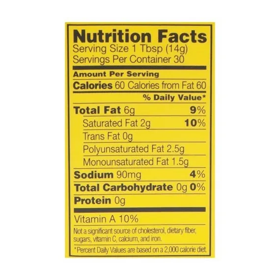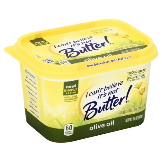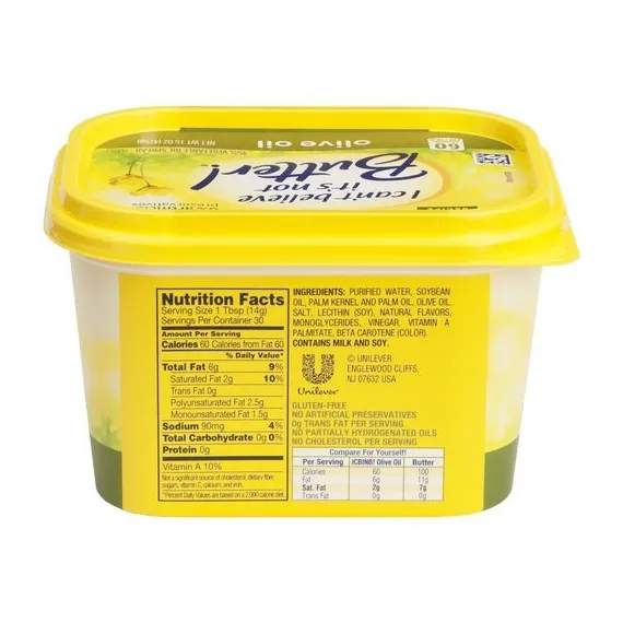 Details Ingredients Purified Water, Soybean Oil, Palm Kernel and Palm Oil, Olive Oil, Salt, Lecithin (Soy), Natural Flavors, Monoglycerides, Vinegar, Vitamin A Palmitate, Beta Carotene (Color). Show more Product features Vegetable Oil Spread, Olive Oil, Tub 15 OZ New space saver tub. Still 15 oz. New! Simple recipe. 100% taste. 0 % artificial preservatives. 60 calories per 1 tbsp. Non-GMO Sourced (We source ingredients that are not genetically modified. However, in the field-to-tub journey of making our buttery spread there is some contact with genetically modified vegetable oils, resulting in a small amount in this product. See our website for more information). Gluten free. No artificial preservatives. 0 g trans fat per serving. No partially hydrogenated oils. No cholesterol per serving. Compare For Yourself Per Serving: Calories: ICBINB! Olive Oil: 60, Butter: 100; Fat: ICBINB! Olive Oil: 6 g , Butter: 11 g; Sat. Fat: ICBINB! Olive Oil: 2 g, Butter: 7 g; Trans Fat: ICBINB! Olive Oil: 0 g, Butter: 0 g. Made with simple ingredients like a delicious blend of oils, purified water & pinch of salt. Fresh butter taste! 70% less saturated fat than butter. 40% fewer calories than butter. 0 g trans fat (See nutrition information for fat and saturated fat content) per serving. No partially hydrogenated oils. It's time to believe! For delicious recipes visit yummly.com/icbinb and for more information visit ICantBelieveItsNotButter.com. Questions or comments? Call 1-800-634-032. Keep refrigerated. For best quality, do not freeze. Best if used by date in lid. Contains: milk and soy. 15 oz (425 g) Englewood Cliffs, NJ 07632 800-634-0302 Unilever Vegetable Oil Spread, 45%, Olive Oil New space saver tub. Still 15 oz. New! Simple recipe. 100% taste. 0 % artificial preservatives. 60 calories per 1 tbsp. Non-GMO Sourced (We source ingredients that are not genetically modified. However, in the field-to-tub journey of making our buttery spread there is some contact with genetically modified vegetable oils, resulting in a small amount in this product. See our website for more information). Gluten free. No artificial preservatives. 0 g trans fat per serving. No partially hydrogenated oils. No cholesterol per serving. Compare For Yourself Per Serving: Calories: ICBINB! Olive Oil: 60, Butter: 100; Fat: ICBINB! Olive Oil: 6 g , Butter: 11 g; Sat. Fat: ICBINB! Olive Oil: 2 g, Butter: 7 g; Trans Fat: ICBINB! Olive Oil: 0 g, Butter: 0 g. Made with simple ingredients like a delicious blend of oils, purified water & pinch of salt. Fresh butter taste! 70% less saturated fat than butter. 40% fewer calories than butter. 0 g trans fat (See nutrition information for fat and saturated fat content) per serving. No partially hydrogenated oils. It's time to believe! For delicious recipes visit yummly.com/icbinb and for more information visit ICantBelieveItsNotButter.com. Questions or comments? Call 1-800-634-032. Special Features No trans fat Net Quantity of Content 30 X 1 Tbsp