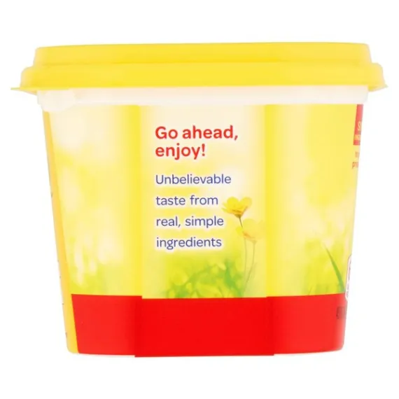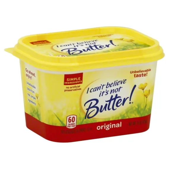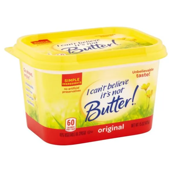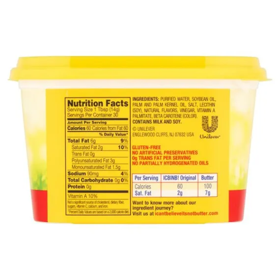 Details Ingredients Purified Water, Soybean Oil, Palm and Palm Kernel Oil, Salt, Lecithin (Soy), Natural Flavors, Vinegar, Vitamin A Palmitate, Beta Carotene (Color). Show more Product features Vegetable Oil Spread, Original, Tub 15 OZ Simple ingredients. No artificial preservatives. Unbelievable taste! 60 calories per 1 tbsp. Gluten-free. 0 g trans fat per serving. No partially hydrogenated oils. Per Serving: ICBINB! Original: 60 calories; 2 g sat fat. Butter: 100 calories; 7 g sat fat. Want to know more about our ingredient journey? Visit us at icantbelieveitsnotbutter.com. Go ahead, enjoy! Unbelievable taste from real, simple ingredients. 70% less saturated fat than butter. 40% fewer calories than butter. 0 g trans fat per serving. No partially hydrogenated oils. See nutrition information for fat and saturated fat content. Questions or comments? Call 1-800-634-0302. Visit us at icantbelieveitsnotbutter.com. Keep refrigerated. For best quality do not freeze. Best if used by date on lid. Contains milk and soy. 15 oz (425 g) Englewood Cliffs, NJ 07632 800-634-0302 Unilever Vegetable Oil Spread, 45%, Original Simple ingredients. No artificial preservatives. Unbelievable taste! 60 calories per 1 tbsp. Gluten-free. 0 g trans fat per serving. No partially hydrogenated oils. Per Serving: ICBINB! Original: 60 calories; 2 g sat fat. Butter: 100 calories; 7 g sat fat. Want to know more about our ingredient journey? Visit us at icantbelieveitsnotbutter.com. Go ahead, enjoy! Unbelievable taste from real, simple ingredients. 70% less saturated fat than butter. 40% fewer calories than butter. 0 g trans fat per serving. No partially hydrogenated oils. See nutrition information for fat and saturated fat content. Questions or comments? Call 1-800-634-0302. Visit us at icantbelieveitsnotbutter.com. Special Features No trans fat Net Quantity of Content 30 X 1 Tbsp
