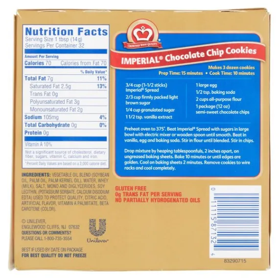 Details Ingredients Vegetable Oil Blend (Soybean Oil, Palm Oil, Palm Kernel Oil), Water, Whey (Milk), Salt, Mono and Diglycerides, Soy Lecithin, (Potassium Sorbate, Calcium Disodium edta) used to protect quality, Citric Acid, Artificial Flavor, Vitamin A Palmitate, Beta Carotene (Color). Show more Product features Vegetable Oil Spread, 53%, Box 16 OZ Good for baking! 0 g trans fat per serving. See nutrition information for fat and saturated fat content. Crowned with quality. Per 1 Tbsp: 70 calories; 2.5 g sat fat (13% DV); 105 mg sodium (4% DV); 0 g sugars. Questions or comments? Please call 1-800-735-3554. Gluten free. No partially hydrogenated oils. Best if used by date on package. For best quality do not freeze. 16 oz (1 lb) 453 g Englewood Cliffs, NJ 07632 800-735-3554 Unilever Vegetable Oil Spread, 53% Good for baking! 0 g trans fat per serving. See nutrition information for fat and saturated fat content. Crowned with quality. Per 1 Tbsp: 70 calories; 2.5 g sat fat (13% DV); 105 mg sodium (4% DV); 0 g sugars. Questions or comments? Please call 1-800-735-3554. Gluten free. No partially hydrogenated oils. Special Features Cholesterol free Net Quantity of Content 32 X 1 Tbsp