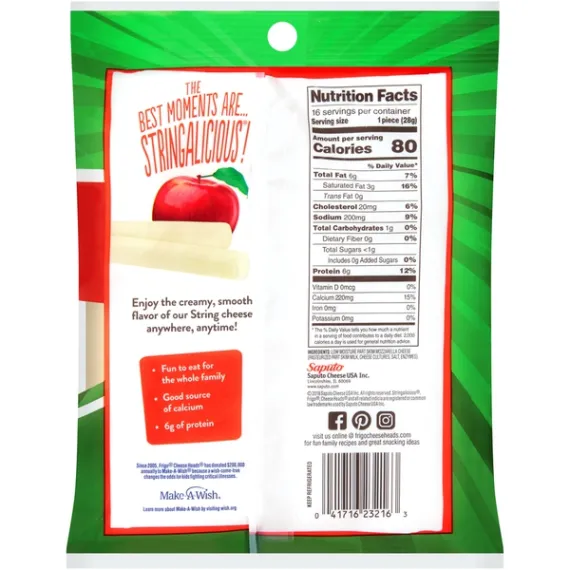 Details Ingredients Ingredients: Low Moisture Part Skim Mozzarella Cheese (Pasteurized Part Skim Milk, Cheese Cultures, Salt, Enzymes). Product features Frigo Cheese Heads String Cheese is only 80 calories with 6 grams of protein. Our low moisture part skim mozzarella cheese is creamy & delicious. Our string cheese is individually wrapped is the perfect snack for the on-the-go family! Use them to make easy homemade snacks like mozzarella sticks. Our String cheese snack makes every break time fun. Frigo Cheese Heads Mozzarella String Cheese, 16 Oz., 16 Count: 80 calories per serving 6 grams of protein Made from milk Great on-the-go snack Net Quantity of Content 16 X 28 g