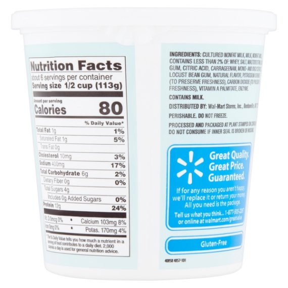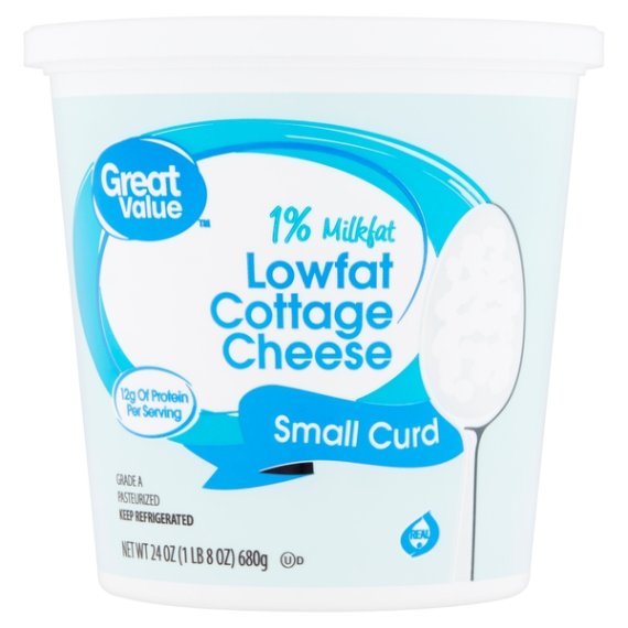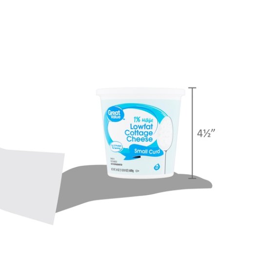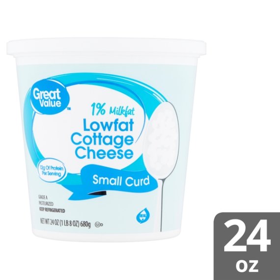 Details Ingredients CULTURED NONFAT MILK, MILK, NONFAT MILK, CONTAINS LESS THAN 2% OF: WHEY, SALT, MALTODEXTRIN, GUAR GUM, CITRIC ACID, CARRAGEENAN, MONO AND DIGLYCERIDES, LOCUST BEAN GUM, POTASSIUM SORBATE AND CARON DIOXIDE (TO PRESERVE FRESHNESS), NATURAL AND ARTIFICIAL FLAVOR, VITAMIN A PALMITATE, ENZYME. Show more Product features Enjoy a healthy and tasty treat with Great Value 1% Milkfat Lowfat Small Curd Cottage Cheese. You can take comfort in knowing our Grade A lowfat cottage cheese has earned the REAL® Seal, assuring you are buying a genuine dairy product. It is the perfect, protein-packed breakfast accompaniment alongside some sliced strawberries or pineapple, or stuffed in between slices of French toast for a truly decadent meal. Get creative in the kitchen and purée our cottage cheese with some honey for a delightful spread for toast or English muffins. Make the wholesome choice with Great Value 1% Milkfat Lowfat Small Curd Cottage Cheese. Great Value products provide families with affordable, high quality grocery and household consumable options. With our wide range of product categories spanning grocery and household consumables, we offer you a variety of products for your family's needs. Our products are conveniently available online and in Walmart stores nationwide, allowing you to stock up and save money at the same time. 1% lowfat cottage cheese Small curd Grade A Pasteurized Gluten-free 12g of protein per serving 24oz container Special Features No artificial flavors Net Quantity of Content 6 X 0.5 cup
