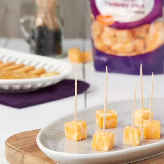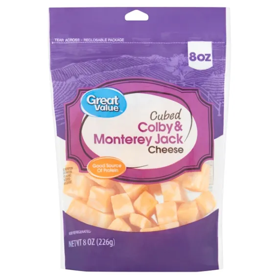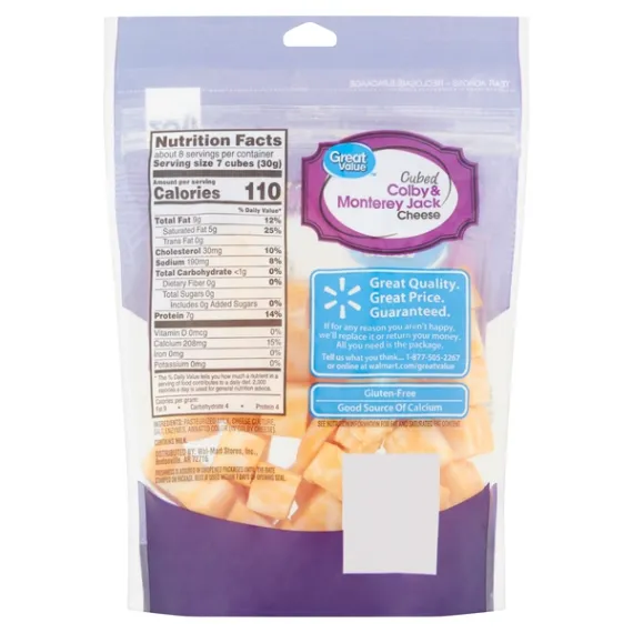 Details Ingredients Pasteurized Milk, Cheese Culture, Salt, Enzymes, Annatto Color (in Colby Cheese) Product features Taste the delicious combination of Great Value Cubed Colby & Monterey Jack Cheese. Our 8-ounce bag contains pre-cut cubes that are perfect for snacking. Easily prepare a cheese plate for guests by pairing with some pepperoni and grapes. Pack some cubes into school or work lunches along with pretzels for a satisfying snack. This gluten-free cheese is a good source of protein and calcium, so you can be sure you're making a tasty and nutritious choice. Enjoy the convenience and rich taste of Great Value Cubed Colby & Monterey Jack Cheese anytime. Great Value products provide families with affordable, high quality grocery and household consumable options. With our wide range of product categories spanning grocery and household consumables, we offer you a variety of products for your family's needs. Our products are conveniently available online and in Walmart stores nationwide, allowing you to stock up and save money at the same time. 8oz package Cubed Colby & Monterey Jack cheese Good source of protein and calcium Great for snacking Special Features No artificial flavors Net Quantity of Content 8 X 7 cubes (30g)