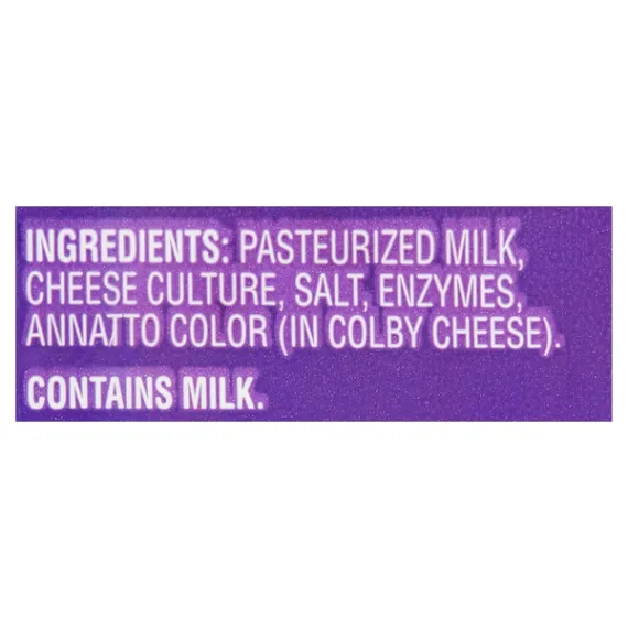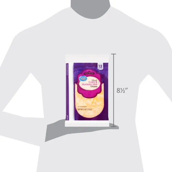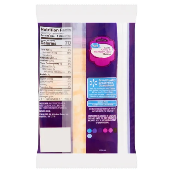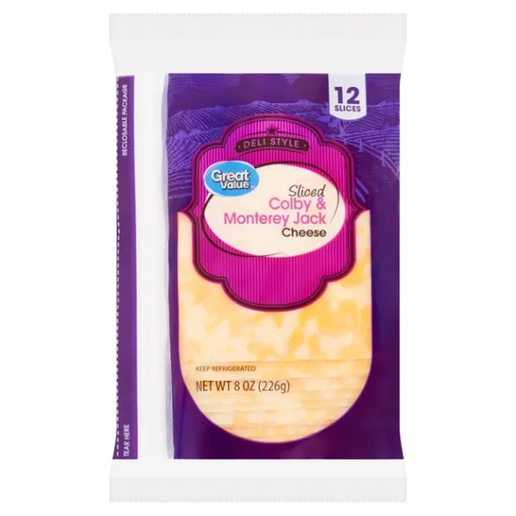 Details Ingredients PASTEURIZED MILK, CHEESE CULTURE, SLAT, ENZYMES, ANNATTO COLOR(IN COLBY CHEESE). Product features Elevate your next epic sandwich with a couple of slices of Great Value Deli Style Sliced Colby & Monterey Jack Cheese. Sweet, nutty Colby combines with meltable, mild Monterey Jack for a cheese that's full of flavor and utterly irresistible. Layer slices of our yummy cheese inside a lasagna, quesadilla, or grilled cheese for melty goodness the whole family will love. With only 70 calories per slice and 4 grams of protein, you can afford to indulge. Mealtime just got better with Great Value Deli Style Sliced Colby & Monterey Jack Cheese. Great Value products provide families with affordable, high quality grocery and household consumable options. With our wide range of product categories spanning grocery and household consumables, we offer you a variety of products for your family's needs. Our products are conveniently available online and in Walmart stores nationwide, allowing you to stock up and save money at the same time. Colby and Monterey Jack cheese 12 slices Deli-style Great source of calcium Gluten-free Net Quantity of Content 11 X 19 g