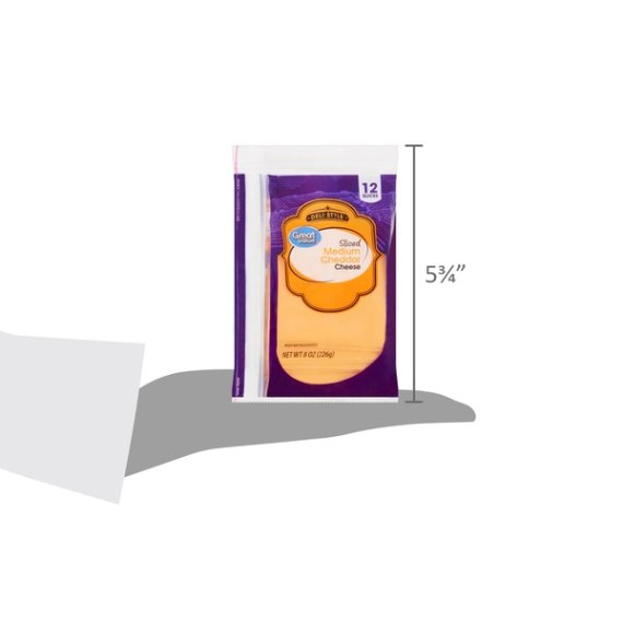 Details Ingredients PASTEURIZED MILK, CHEESE CULTURE, SALT, ENZYMES, ANNATTO COLOR. Product features Add a slice of happiness to your next meal with Great Value Deli Style Sliced Medium Cheddar Cheese. Each slice of cheese in this package of 12 contains 10% of your recommended daily value of calcium. The medium flavor is just the right middle ground between sharp and mild, so it's sure to satisfy. Pair this cheese with all your savory cravings, whether it's in grilled cheese for the whole family, ham and cheese sandwiches for school lunches, burgers at your next barbecue, or a hearty breakfast sandwich with eggs and bacon. Choose Great Value Deli Style Sliced Medium Cheddar Cheese as a tasty addition to your next family meal. Great Value products provide families with affordable, high quality grocery and household consumable options. With our wide range of product categories spanning grocery and household consumables, we offer you a variety of products for your family's needs. Our products are conveniently available online and in Walmart stores nationwide, allowing you to stock up and save money at the same time. 8oz package 12 slices Medium Cheddar cheese 10% daily value of calcium per slice Net Quantity of Content 12 X 19 g