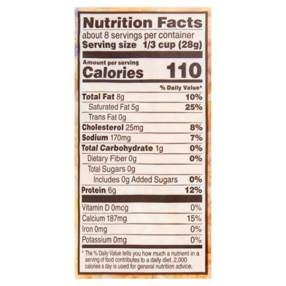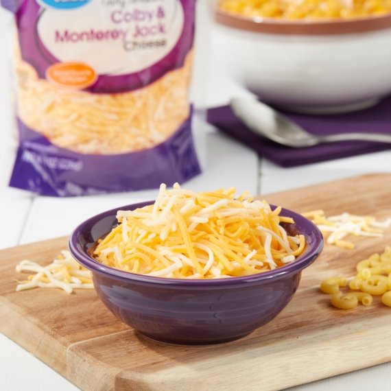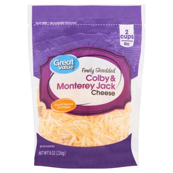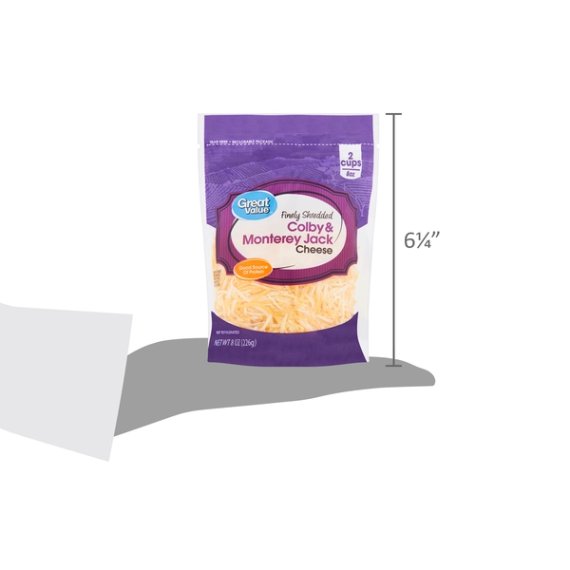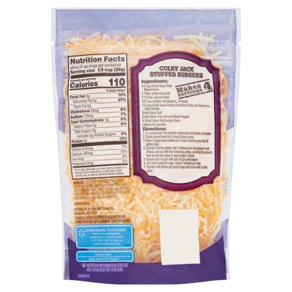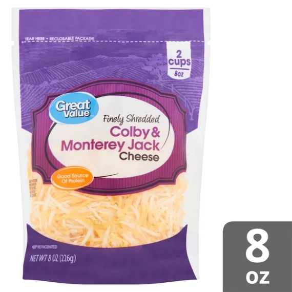 Details Ingredients COLBY AND MONTEREY JACK CHEESE (PASTEURIZED MILK, CHEESE CULTURE, SALT, ENZYMES, ANNATTO COLOR [IN COLBY CHEESE]), POTATO STARCH AND POWDERED CELLULOSE ADDED TO PREVENT CAKING, NATAMYCIN (A NATURAL MOLD INHIBITOR). Show more Product features Great Value Finely Shredded Colby & Monterey Jack Cheese adds creamy deliciousness to all your favorite recipes. This 8-ounce package of shredded cheese contains 2 cups of wholesome goodness, and the easy-open seal keeps cheese at optimal freshness. Try creating Colby Jack soup, Baja shrimp tacos, or Colby Jack stuffed burgers for an evening meal that will wow your guests. Any dish served with Great Value Finely Shredded Colby & Monterey Jack Cheese will be sure to have the family coming back for seconds. Great Value products provide families with affordable, high quality grocery and household consumable options. With our wide range of product categories spanning grocery and household consumables, we offer you a variety of products for your family's needs. Our products are conveniently available online and in Walmart stores nationwide, allowing you to stock up and save money at the same time. Net weight: 8oz Reclosable package Finely shredded Colby and Monterey Jack cheese blend Good source of protein and calcium Gluten-free Special Features Rich in calcium Net Quantity of Content 8 X 0.33 cup