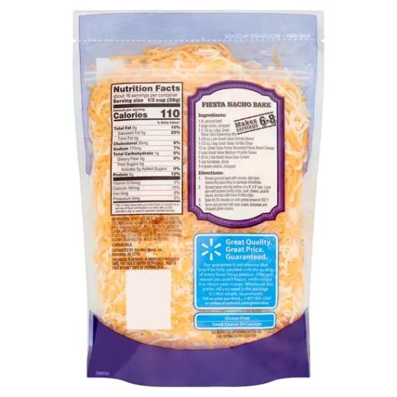 Details Ingredients MONTEREY JACK, CHEDDAR, QUESO QUESADILLA AND ASADERO CHEESES (PASTEURIZED MILK, CHEESE CULTURE, SALT, ENZYMES, ANNATTO COLOR [IN CHEDDAR CHEESE]), POTATO STARCH AND POWDERED CELLULOSE ADDED TO PREVENT CAKING, NATAMYCIN (A NATURAL MOLD INHIBITOR). Show more Product features Shredded Monterey Jack, Cheddar, Queso Quesadilla and Asadero Cheese Great Value Finely Shredded Fiesta Blend Cheese brings delicious flavors to your favorite dishes. Our irresistible blend combines Monterey Jack, Cheddar, Queso Quesadilla, and Asadero cheese. For your next get together, try creating our Fiesta Nacho Bake. Simply brown your favorite ground beef with some onion and taco seasoning and begin layering a baking dish with broken tortillas, your cooked ground beef, picante sauce, and a hearty layer of our shredded cheese. Continue layering until the pan is full, and toss into the oven at 350°F until golden brown. Serve and garnish with sour cream, tomatoes, and chopped green onion. Sprinkle on more Great Value Finely Shredded Fiesta Blend Cheese to complete this delicious dish! Great Value products provide families with affordable, high quality grocery and household consumable options. With our wide range of product categories spanning grocery and household consumables, we offer you a variety of products for your family's needs. Our products are conveniently available online and in Walmart stores nationwide, allowing you to stock up and save money at the same time. Finely shredded Monterey Jack, Cheddar, Queso Quesadilla, and Asadero cheese Fiesta blend Reclosable package Net weight: 1lb (4 cups) Good source of protein and calcium Gluten-free Special Features Finely shredded Net Quantity of Content ABOUT 16 X 0.333 cup