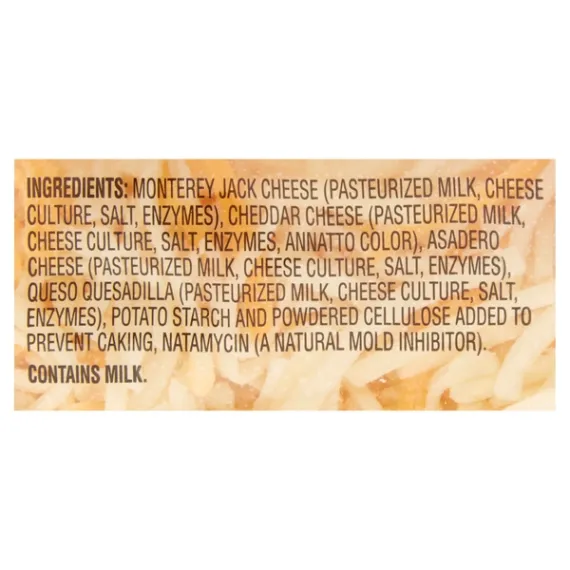 Details Ingredients Monterey Jack Cheese (Pasteurized Milk, Cheese Culture, Salt, Enzymes), Cheddar Cheese (Pasteurized Milk, Cheese Culture, Salt, Enzymes, Annatto Color), Asadero Cheese (Pasteurized Milk, Cheese Culture, Salt, Enzymes), Queso Quesadilla (Pasteurized Milk, Cheese Culture, Salt, Enzymes), Potato Starch and Powdered Cellulose added to prevent caking, Natamycin (a natural mold inhibitor) Show more Product features Shredded Monterey Jack, Cheddar, Queso Quesadilla and Asadero Cheese Great Value Finely Shredded Fiesta Blend Cheese brings delicious flavors to your favorite dishes. Our irresistible blend combines Monterey Jack, Cheddar, Queso Quesadilla, and Asadero cheese. For your next get together, try creating our Mexican Style Ravioli or Fiesta Bake, or simply add it to pack a powerful punch to your next Taco Tuesday spread. Great Value Finely Shredded Fiesta Blend Cheese will bring your south-of-the-border recipes to the next level! Great Value products provide families with affordable, high quality grocery and household consumable options. With our wide range of product categories spanning grocery and household consumables, we offer you a variety of products for your family's needs. Our products are conveniently available online and in Walmart stores nationwide, allowing you to stock up and save money at the same time. Finely shredded Monterey Jack, Cheddar, Queso Quesadilla, and Asadero cheese Fiesta blend Reclosable package Net weight: 2lb (8 cups) Good source of protein and calcium Gluten-free Special Features No artificial flavors Net Quantity of Content 32 X 1/3 cup (28g)