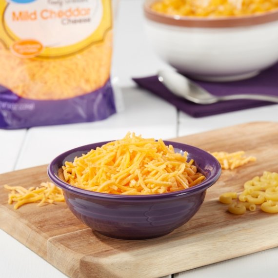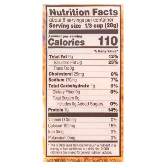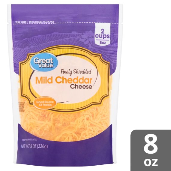 Details Ingredients CHEDDAR CHEESE (PASTEURIZED MILK, CHEESE CULTURE, SALT, ENZYMES, ANNATTO COLOR), POTATO STARCH AND POWDERED CELLULOSE ADDED TO PREVENT CAKING, NATAMYCIN (A NATURAL MOLD INHIBITOR). Show more Product features Great Value Finely Shredded Mild Cheddar Cheese is perfect for melting over your favorite dishes. This 8-ounce package contains 2 cups of wholesome goodness, and the reclosable easy-open seal keeps this cheese fresh for whenever hunger strikes. It makes a great addition to soups and salads, but you can also try creating a Cheesy Chicken Enchilada Bake or Cheesy Chicken Nachos for a meal that will take your mid-week dinner game to the next level. Serve and enjoy dishes made with Great Value Finely Shredded Mild Cheddar Cheese anytime! Great Value products provide families with affordable, high quality grocery and household consumable options. With our wide range of product categories spanning grocery and household consumables, we offer you a variety of products for your family's needs. Our products are conveniently available online and in Walmart stores nationwide, allowing you to stock up and save money at the same time. Mild Cheddar cheese Finely shredded Net weight: 8oz (2 cups) Reclosable package Good source of protein and calcium Gluten-free Special Features Mild|Fancy shredded|Approximately 2 cups|3-A-day milk cheese yogurt Net Quantity of Content 8 X 0.33 cup