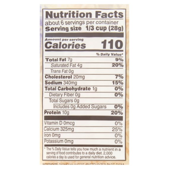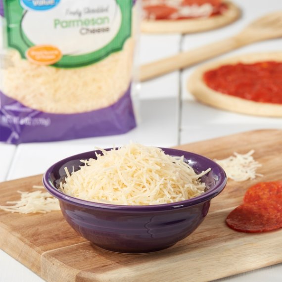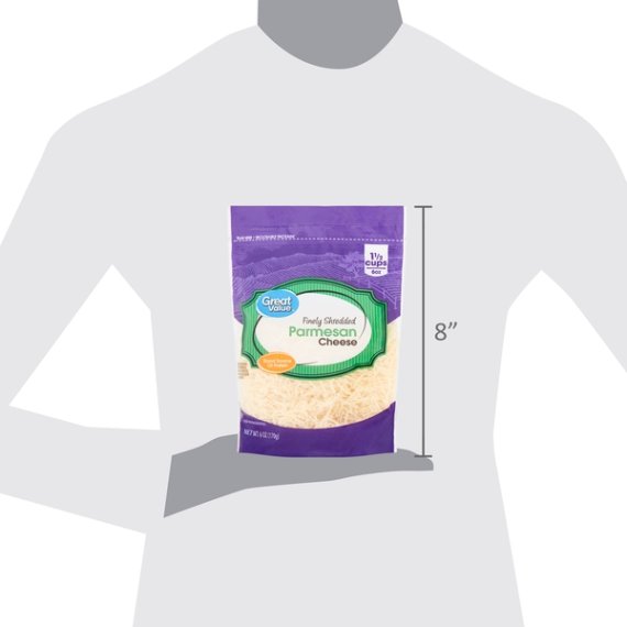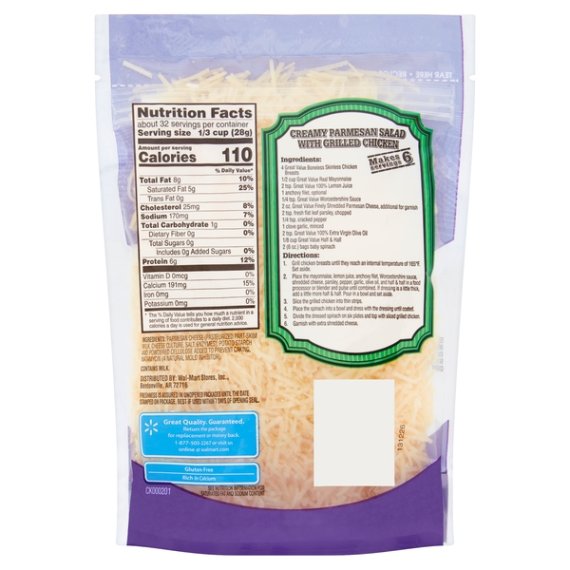 Details Ingredients PARMESAN CHEESE (PASTEURIZED PART-SKIM MILK, CHEESE CULTURE, SALT, ENZYMES), POTATO STARCH AND POWDERED CELLULOSE ADDED TO PREVENT CAKING, NATAMYCIN (A NATURAL MOLD INHIBITOR). Show more Product features Top off your next homemade meal with a generous handful of delicious Great Value Finely Shredded Parmesan Cheese. This 6-ounce bag contains 1.5 cups of finely shredded cheese that is a good way to add extra protein and calcium to your diet. Sprinkle some on a Caesar salad or incorporate it into a risotto. Use it in a scrumptious alfredo sauce to impress your friends and family. Add it to a four-cheese macaroni casserole, or make it the finishing touch on your chicken parmesan. Enhance your next kitchen creation with Great Value Finely Shredded Parmesan Cheese. Great Value products provide families with affordable, high quality grocery and household consumable options. With our wide range of product categories spanning grocery and household consumables, we offer you a variety of products for your family's needs. Our products are conveniently available online and in Walmart stores nationwide, allowing you to stock up and save money at the same time. Finely shredded Parmesan cheese 6oz bag 10g of protein per serving 25% daily value of calcium per serving Special Features No artificial flavors or colors|Rich in calcium|Naturally gluten-free food|Aged over 6 months Net Quantity of Content 6 X 0.33 cup