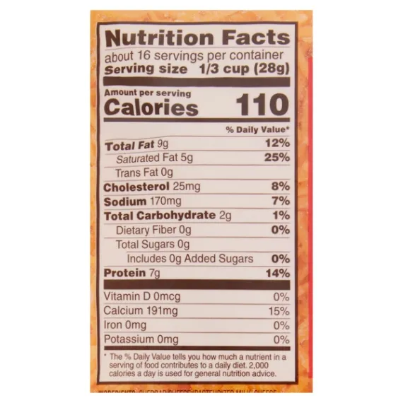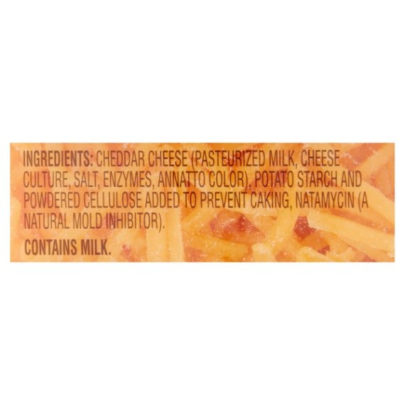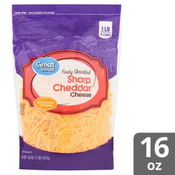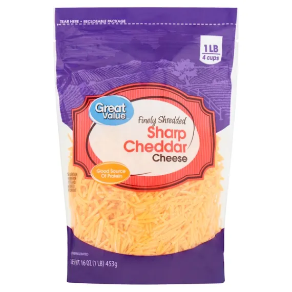 Details Ingredients CHEDDAR CHEESE (PASTEURIZED MILK, CHEESE CULTURE, SALT, ENZYMES, ANNATTO COLOR), POTATO STARCH AND POWDERED CELLULOSE ADDED TO PREVENT CAKING, NATAMYCIN (A NATURAL MOLD INHIBITOR). Show more Product features Enjoy the delicious, rich flavor of Great Value Finely Shredded Sharp Cheddar Cheese. This package of shredded sharp Cheddar cheese contains 4 cups of wholesome goodness, and the easy-open seal keeps cheese at optimal freshness. Cook onion, red and green pepper, egg, ham, and a generous amount of our sharp Cheddar cheese together in a pan to create a delicious, fluffy, Western omelet that will keep you coming back for more! Great Value Finely Shredded Sharp Cheddar Cheese is a great-tasting way to start the day. Great Value products provide families with affordable, high quality grocery and household consumable options. With our wide range of product categories spanning grocery and household consumables, we offer you a variety of products for your family's needs. Our products are conveniently available online and in Walmart stores nationwide, allowing you to stock up and save money at the same time. Net weight: 1lb (4 cups) Reclosable package Good source of protein and calcium Gluten-free Special Features No artificial flavors Net Quantity of Content ABOUT 16 X 0.333 cup