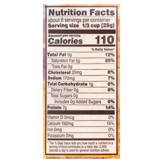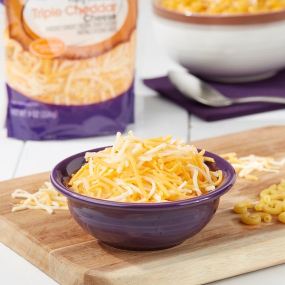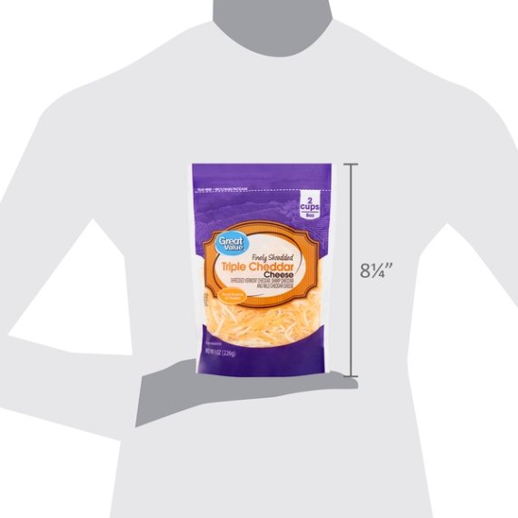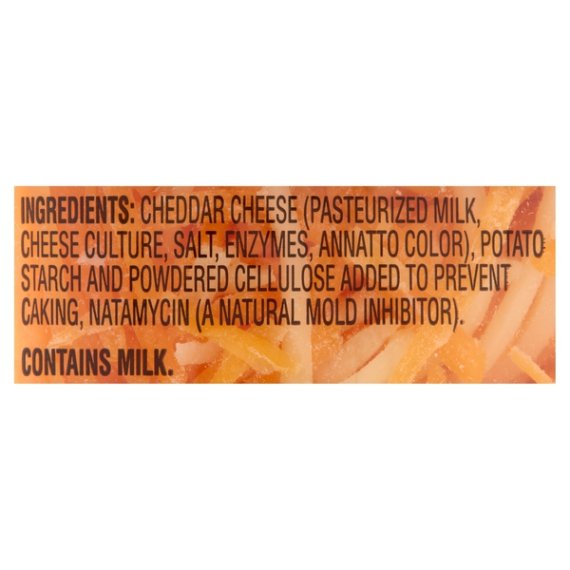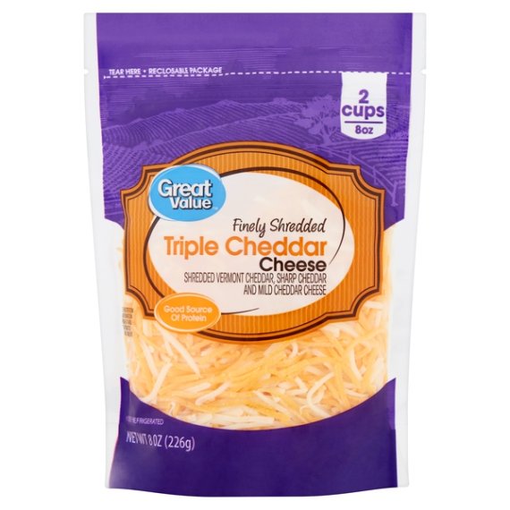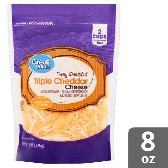Details Ingredients CHEDDAR CHEESE (PASTEURIZED MILK, CHEESE CULTURE, SALT, ENZYMES, ANNATTO COLOR), POTATO STARCH AND POWDERED CELLULOSE ADDED TO PREVENT CAKING, NATAMYCIN (A NATURAL MOLD INHIBITOR). Show more Product features Shredded Vermont Cheddar, Sharp Cheddar and Mild Cheddar Cheese Sprinkle a burst of flavor onto your favorite meals with Great Value Finely Shredded Triple Cheddar Cheese. Our 8-ounce reclosable plastic package is packed with 2 cups of finely shredded Vermont Cheddar, Sharp Cheddar, and Mild Cheddar cheese. It's exceptionally delicious and an excellent source of protein, providing 7 grams per serving. This delicately shredded cheese is the perfect topping for tacos, cheeseburgers, chili dogs, and mac and cheese. Take your dinners to the next level with tasty, time-saving Great Value Finely Shredded Triple Cheddar Cheese. Great Value products provide families with affordable, high quality grocery and household consumable options. With our wide range of product categories spanning grocery and household consumables, we offer you a variety of products for your family's needs. Our products are conveniently available online and in Walmart stores nationwide, allowing you to stock up and save money at the same time. 2 cups of finely shredded cheese Vermont Cheddar, Sharp Cheddar, and Mild Cheddar 8oz reclosable plastic package 7g of protein per serving Net Quantity of Content ABOUT 8 X 1/3 cup
