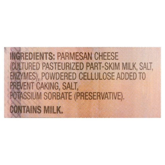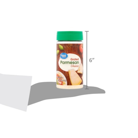 Details Ingredients PARMESAN CHEESE (PASTEURIZED CULTURED MILK, SALT, ENZYMES), POWDERED CELLULOSE (ADDED TO PREVENT CAKING), POTASSIUM SORBATE (ADDED TO PROTECT FLAVOR). Show more Product features Elevate your next meal with Great Value Grated Parmesan Cheese. Parmesan is a hard cheese with fruity and nutty notes, making it an excellent complement to soups, salads, meat, and seafood dishes. Sprinkle some over Caesar salad or homemade pasta, top a crock of warm French onion soup, or stir it into gourmet mac and cheese. With only 20 calories in every tasty serving and zero carbohydrates, you can afford to indulge. Make a meal the whole family will love with some Great Value Grated Parmesan Cheese. Great Value products provide families with affordable, high quality grocery and household consumable options. With our wide range of product categories spanning grocery and household consumables, we offer you a variety of products for your family's needs. Our products are conveniently available online and in Walmart stores nationwide, allowing you to stock up and save money at the same time. No carbohydrates Zero trans, polyunsaturated, monounsaturated fats 20 calories per serving Gluten free Net weight: 8oz Special Features Aged for more than 10 months Net Quantity of Content ABOUT 45 X 1 Tbsp