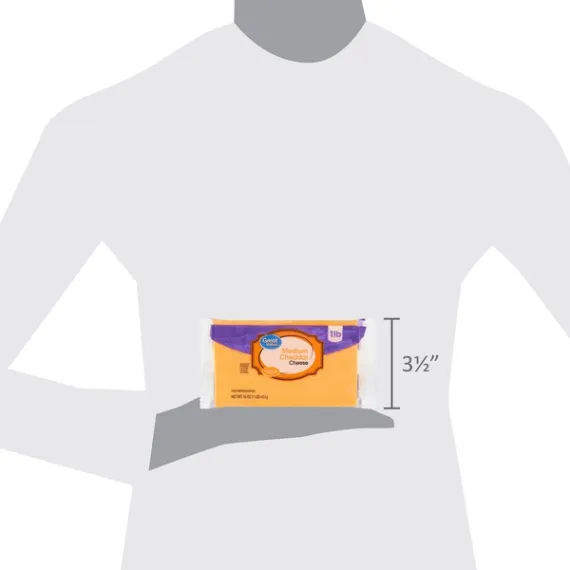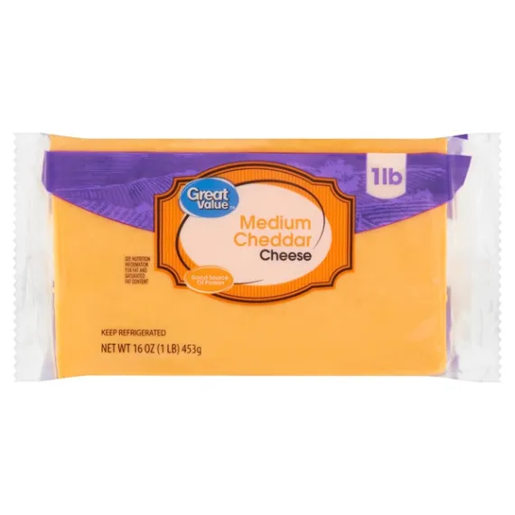 Details Ingredients PASTEURIZED MILK, CHEESE CULTURE, SALT, ENZYMES, ANNATTO COLOR. Product features Mealtime is better with some Great Value Medium Cheddar Cheese. Cheddar cheese originates from the village of Cheddar in Somerset, England, and has become widely popular around the world. Add a few slices to a cheese board with some jam, honey, and crostini for a delicious appetizer, melt some into a creamy omelet, or simply enjoy a few chunks with red or green grapes. An excellent source of calcium and protein -- this cheese is a great choice for a healthy lifestyle. When hunger strikes, grab a block of Great Value Medium Cheddar Cheese. Great Value products provide families with affordable, high quality grocery and household consumable options. With our wide range of product categories spanning grocery and household consumables, we offer you a variety of products for your family's needs. Our products are conveniently available online and in Walmart stores nationwide, allowing you to stock up and save money at the same time. Medium Cheddar cheese Net weight: 16oz (1lb) Good source of protein and calcium Gluten-free Special Features No artificial flavors Net Quantity of Content 16 X 1 oz