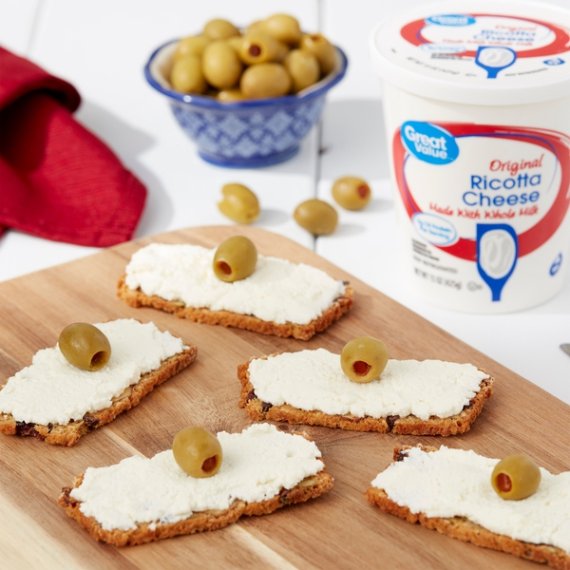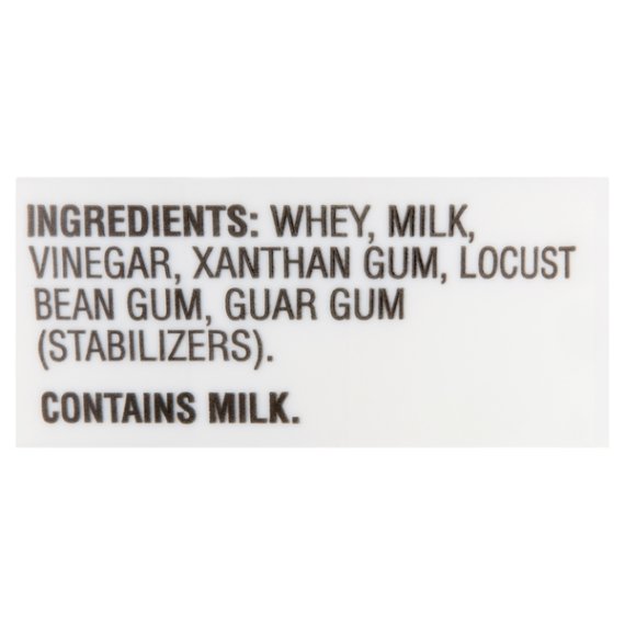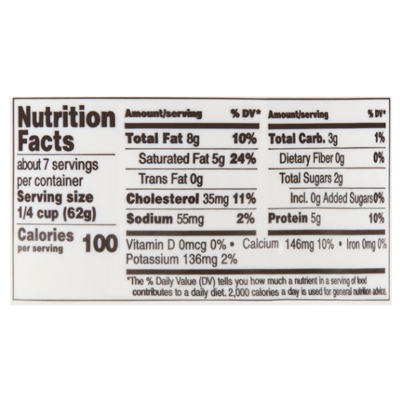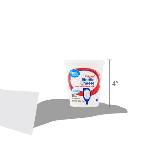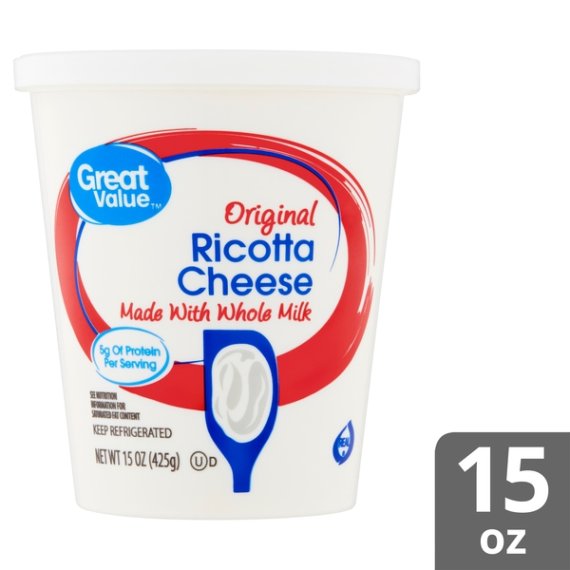 Details Ingredients WHEY, MILK, VINEGAR, XANTHAN GUM, LOCUST BEAN GUM, GUAR GUM (STABILIZERS). Product features Savor the classic, creamy taste of Great Value Original Ricotta Cheese. Made with whole milk, our cheese is bound to be a satisfying addition to many homemade dishes. Use this Ricotta in a traditional lasagna or stuffed manicotti recipe for a dinner that your family will love. Stir it into scrambled eggs to enhance a light breakfast. Top a flatbread with Ricotta cheese and veggies for a quick lunch. Each serving contains 5 grams of protein and 10 percent of your recommended daily value of calcium. Try Great Value Original Ricotta Cheese as a rich and hearty addition to your next meal. Great Value products provide families with affordable, high quality grocery and household consumable options. With our wide range of product categories spanning grocery and household consumables, we offer you a variety of products for your family's needs. Our products are conveniently available online and in Walmart stores nationwide, allowing you to stock up and save money at the same time. 15oz container Made with whole milk 5g of protein per serving 10% daily value of calcium per serving Special Features No artificial flavors or colors Net Quantity of Content ABOUT 7 X 0.25 cup